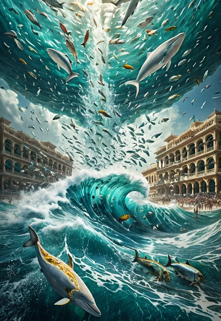 Sea wildlife—small fish , drops , and shells—rise from the wavy-ocean , suspended within the turbulence. appears to dissolve into a shifting , storm-like vortex made of blues , greens , yellows , and muted reds. Arabian ocean and in front a group of peoples with white whale coming from vortex. The surrounding clouds billow up to the ceiling. bright daylight , realistic lighting , sharp details , cinematic realism , only hyper-realistic photography style. ,