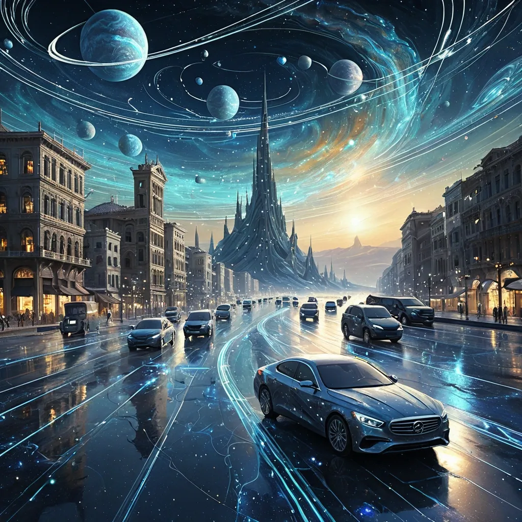 A masterpiece painting depicting a serene celestial landscape where city street are made of swirling galaxies and street flow with lines starlight. Ethereal group of vehicle composed of pure light wander the plains. This image should be a triumph of digital art , embodying the pinnacle of surrealism and matte painting techniques , suitable for a masterpiece showcase. ,