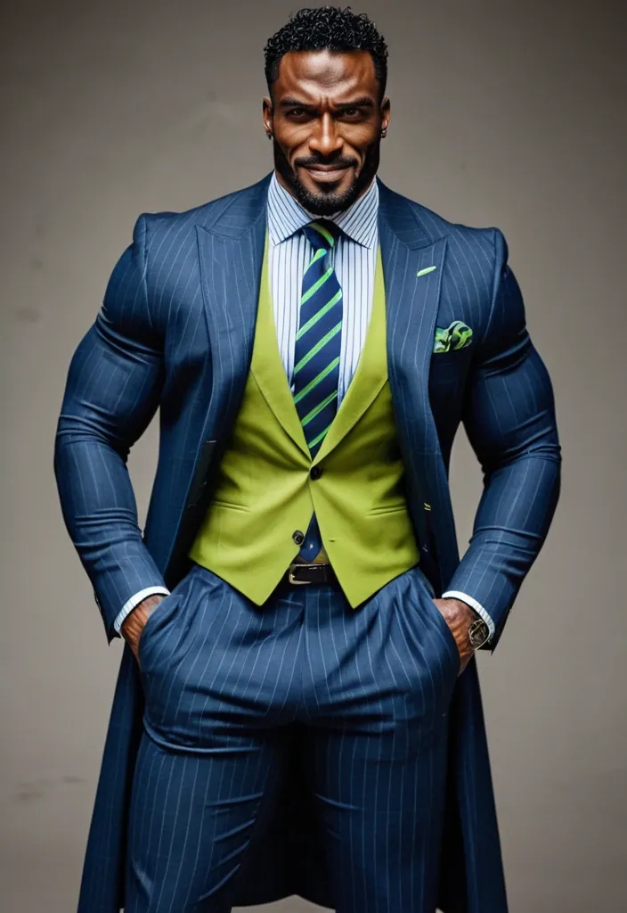 Generate ruggedly handsome dark-skinned African-American man abnormally massive male bodybuilder , , close up , full lips , big booty , black trimmed coarse hair , big , muscular man , brown strikingly intense and alluring eyes , up close , flexing biceps , beautiful brown eyes , legs are iconic and defining physical feature , both visually and in terms of combat ability.wearing an outfit that is a striking blend of elegance , power , and femininity , designed to command attention in any room. The suit is tailored to perfection , hugging the wearer’s curves with precision while emphasizing a structured silhouette. The fabric itself is a refined grey tweed patterned with subtle white grid lines , giving the suit a texture that feels both sophisticated and modern. The blazer features broad blue lapels and gold button accents , adding a luxurious touch that elevates the look beyond typical business attire. The matching high-waisted trousers elongate the frame , further enhancing the poised and commanding effect of the ensemble.The styling choices amplify the boldness of the suit. The inner shirt is a silky , greybutton-down shirt that complements the tweed’s tone while introducing a masculine balance to the sharp tailoring of the jacket. The shirt peeks out neatly from under the blazer , maintaining elegance without drawing focus away from the suit’s commanding cut. Accessories are kept minimal yet intentional: a delicate layered gold necklace ad alpha leader of light and luxury without overpowering the outfit completing the commanding visual.Altogether , this look communicates a blend of authority and allure. It is business-ready yet fashion-forward , balancing corporate structure with vibrant femininity. The color palette blue , grey and gold avoids being overly delicate , instead embracing the richness of texture , structure , and presence. This is the kind of ensemble that speaks to ambition , sophistication , and personal style—ideal for someone who thrives in positions of influence but insists on expressing her individuality with bold elegance. It’s not just clothing—it’s a statement of power wrapped in grace. In luxury living legs that could crush a watermelon , skirt high boots are a bold and striking statement piece , crafted in glossy black patent leather that gives them a sleek , polished finish. Rising to just below the knee , the boots feature three adjustable buckle straps along the shaft , adding both edge and detail to their design. The towering stiletto heel , paired with a thick platform sole , creates an ultra-dramatic silhouette that elongates the leg and exudes power and confidence. With their combination of shine , height , and structure , these boots perfectly balance fierce femininity with high-fashion allure , He’s wearing a sharp three-piece suit layered under a long , lime green shirt. Navy blue trench coat , blue and green striped necktie , navy blue slacks , giving him a powerful , polished , smiling . ,