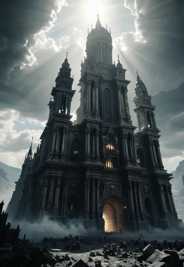 A colossal , impressive megastructure rises from the ground with much dust and roar , ready to wander further. Equipped with Victorian Baroque architecture , structures like churches and towers reminiscent of Warhammer 40k , it rises above mountains , villages , fog banks , and clouds , captured with sweeping , cinematic camera movements. Dramatic , high-contrast lighting emphasizes every surface detail , with sharp shadows and piercing sunbeams cutting through the atmosphere. The camera slowly pans from ground to sky , then circles the behemoth , which extends mighty , baroque-inspired organ pipes to sound a powerful call to worship , revealing its immense dimensions from multiple perspectives. Ultra-realistic 8K , hyper-detailed textures , dynamic light reflections , cinematic depth , and stunning visual impact. The scene feels epic , otherworldly , and breathtakingly immersive. ,