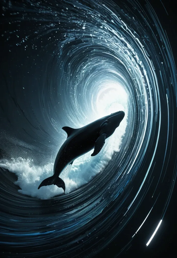 Taken from a Go-pro , Vertical Plunge , Dive towards the surface , rapidly approaching the ocean , colorful image of falling through the vortex air , emphasizes falling acceleration. The holographic elements should create a sense of movement and energy with silhouette of a humpback whale from darkness , motion speed. Employ a black color palette of sapphire black with iridescent shimmer. Style: Celestial , ethereal , abstract , digital art black Lighting: Dramatic backlighting , contrasting dark background Composition: dynamic diagonal , composition , upward gaze Details: vortex water waves and bobbles , streaking white light trails , sense of movement and wonder , magical atmosphere Quality: High detail , 4K , Masterpiece , Rendered in Octane. ,