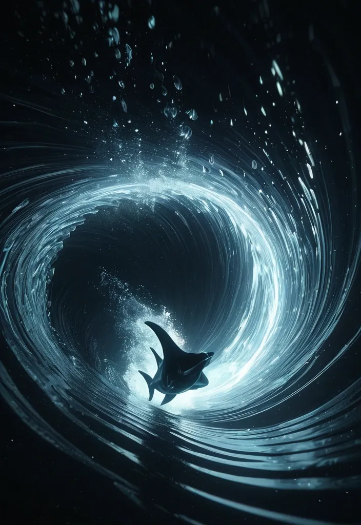Taken from a Go-pro , Vertical Plunge , Dive towards the surface , rapidly approaching the ocean , colorful image of falling through the vortex air , emphasizes falling acceleration. The holographic elements should create a sense of movement and energy with silhouette of a manta ray gliding through darkness , motion vortex speed. Employ a black color palette of sapphire black with iridescent shimmer. Style: Celestial , ethereal , abstract , digital art black Lighting: Dramatic backlighting , contrasting dark background Composition: dynamic diagonal , composition , upward gaze Details: vortex water waves and bobbles , streaking white light trails , sense of movement and wonder , magical atmosphere Quality: High detail , 4K , Masterpiece , Rendered in Octane. ,