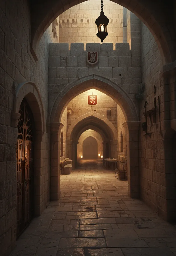 Jerusalem Hospital , standing within ancient stone walls of the Crusader city , arched corridors lit by torchlight and open courtyards echoing with age , the order’s emblem carved above the gate , Style: Matte Painting , detailed and atmospheric , Eye-level view , Full scene , 4K ,