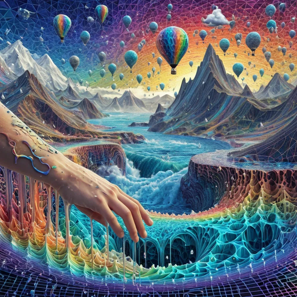 A surreal landscape emerging from Hand Melting from the time spill in air , rendered as a Fractal circuit Tessellation , with intricate , repeating holographic patterns and geometric tessellations. backdrop of dripping rainbow liquid , showing mountains , ocean and Matrix code flowing like sea waves. while iconic dolphin jumping from the hand , distance ocean with splash water-waves , hot air-balloon fly in the night sky , ,
