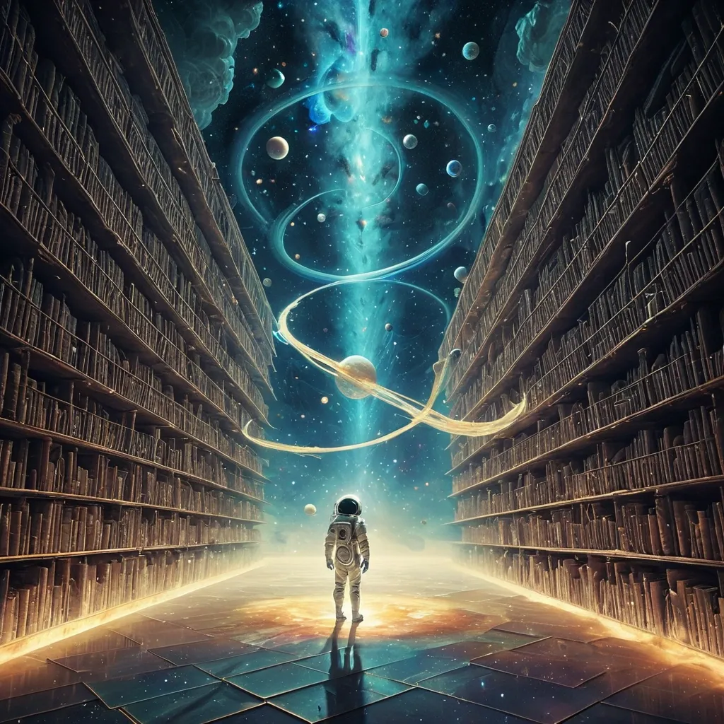 An astronaut floating in a vast , nebulae-filled void , tethered to a colossal , ancient library that drifts through space. Bookshelves stretch into infinity , filled with glowing tomes. Ethereal light emanates from celestial bodies , casting long shadows. The style is a blend of surrealism and abstract art , with an ethereal , cosmic atmosphere reminiscent of artists like Remedios Varo and Yves Tanguy , emphasizing a sense of wonder and cosmic discovery. ,
