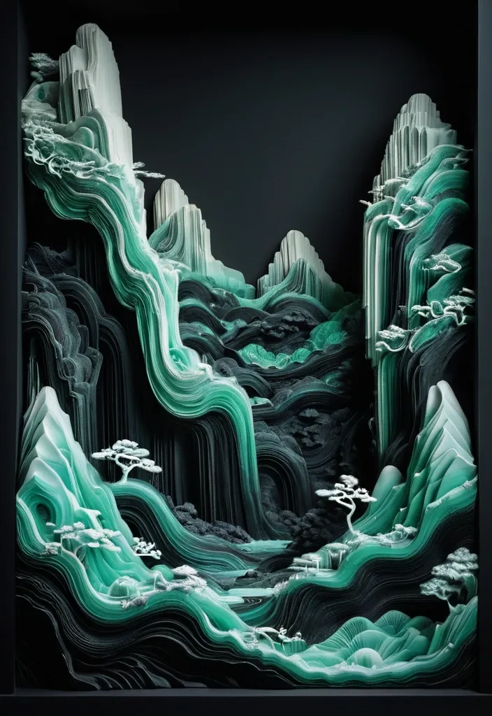 A vertical composition 3D topographic layered sculpture of a grand Chinese landscape. The style is Neo-Chinese minimalism. Countless flowing , organic layers of semi-translucent jade-like porcelain and textured paper stack. Deep ambient occlusion creates soft , profound shadows between the layers , giving incredible depth and tactile quality. Peacock in dance pose , fluorescent black ripples of the wide open feathers , surrealism Fractal Symphony of northern lights , with intricate , repeating patterns and a sense of harmony. The edges of the landscape fade softly into a pure black background with ample negative space (liu bai) at the top. Studio lighting , ultra-detailed , intricate textures. ,