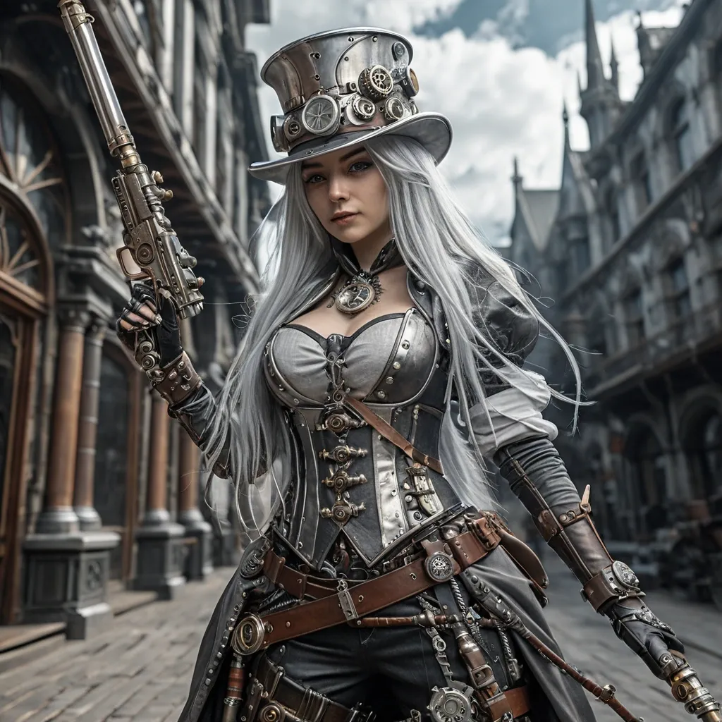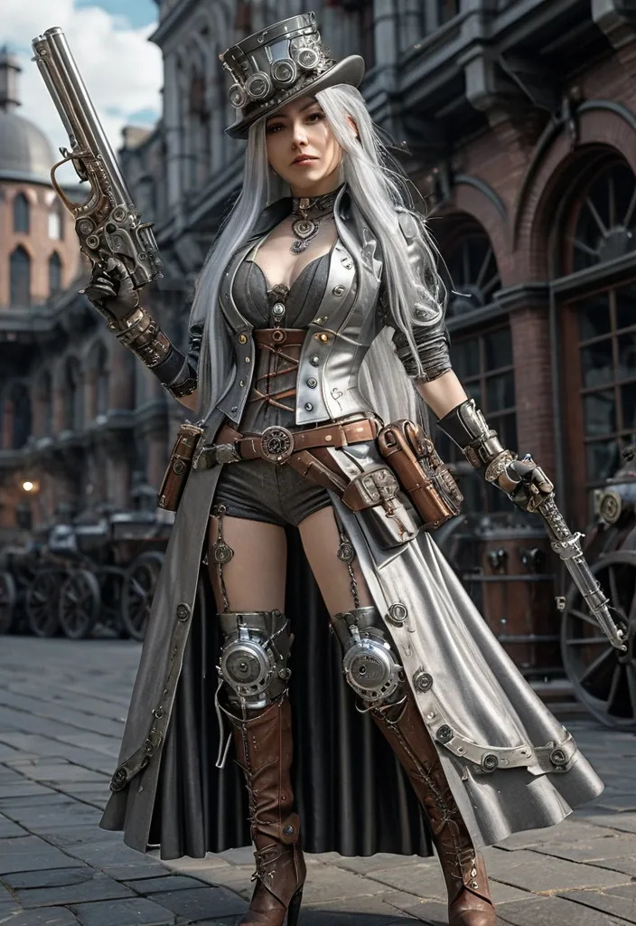 full lenght , a beautiful european freckled female with wavy auburn shoulder hair in her mid twenty in red and white turtleneck sleeveless steampunk corset minidress , gentle smile a hand on hip she's standing lovely in front of a mirror in a steampunk workshop with japanese influence , some tools and alchemistry objects and a green plant , furniture bookcase , steampunk cinematic style ,