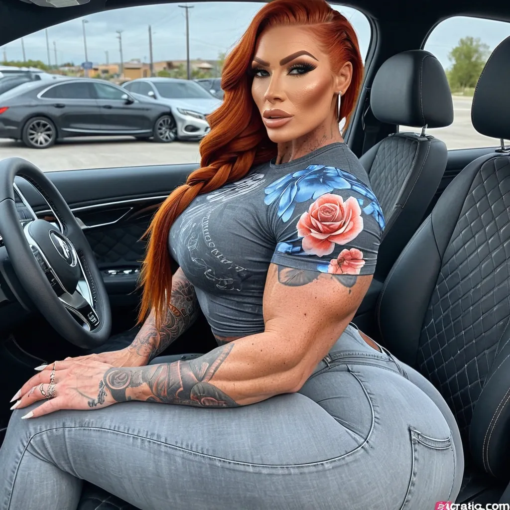 Generate Gorgeous female boss , bimbo , hourglass body , abnormally massive female bodybuilder , gorgeous , close up , full lips , big booty , redheaded , freckles on face and breast , braided design hair , feminine silhouette , too big breast , big booty , sexy thighs abs , silhouette , up close , flexing biceps , beautiful green eyes , legs are iconic and defining physical feature , both visually and in terms of combat ability.wearing an outfit that is a striking blend of elegance , power , and femininity , designed to command attention in any room. The suit is tailored to perfection , hugging the wearer’s curves with precision while emphasizing a structured silhouette. The fabric itself is a refined grey tweed patterned with subtle white grid lines , giving the suit a texture that feels both sophisticated and modern. The blazer features broad blue lapels and gold button accents , adding a luxurious touch that elevates the look beyond typical business attire. The matching high-waisted trousers elongate the frame , further enhancing the poised and commanding effect of the ensemble.The styling choices amplify the boldness of the suit. The inner blouse is a silky , greybutton-down shirt that complements the tweed’s tone while introducing a softer , feminine balance to the sharp tailoring of the jacket. The blouse peeks out neatly from under the blazer , maintaining elegance without drawing focus away from the suit’s commanding cut. Accessories are kept minimal yet intentional: a delicate layered gold necklace and hoop earrings that add glimmers of light and luxury without overpowering the outfit. The choice of voluminous , honey-brown braids cascading down her shoulders frames the face with both confidence and glamour , completing the commanding visual.Altogether , this look communicates a blend of authority and allure. It is business-ready yet fashion-forward , balancing corporate structure with vibrant femininity. The color palette blue , grey and gold avoids being overly delicate , instead embracing the richness of texture , structure , and presence. This is the kind of ensemble that speaks to ambition , sophistication , and personal style—ideal for someone who thrives in positions of influence but insists on expressing her individuality with bold elegance. It’s not just clothing—it’s a statement of power wrapped in grace. In luxury living legs that could crush a watermelon , skirt high boots are a bold and striking statement piece , crafted in glossy black patent leather that gives them a sleek , polished finish. Rising to just below the knee , the boots feature three adjustable buckle straps along the shaft , adding both edge and detail to their design. The towering stiletto heel , paired with a thick platform sole , creates an ultra-dramatic silhouette that elongates the leg and exudes power and confidence. With their combination of shine , height , and structure , these boots perfectly balance fierce femininity with high-fashion allure. Massive breast , , driving and sitting a car , wearing a black , blue amd gray floral t-shirt , gray denim pants , enormous butt ,