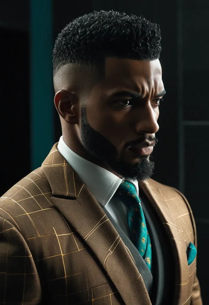 He is an African American man with a striking , sculpted hairstyle that blends precision and edge. The sides of his head are shaved clean , while the top is left textured and natural , short curls forming a controlled crown. A sleek metallic band arcs across his hairline like a deliberate accent rather than decoration , reinforcing a sense of discipline and intent. His face is intense and angular , brow slightly furrowed , eyes cast downward with focused restraint , as if he’s thinking several moves ahead. His build is powerful but refined—broad through the shoulders , solid through the chest , and carried with an upright , composed posture. This is not brute bulk , but strength honed and contained , the kind that comes from control rather than excess. A full , well-shaped beard frames his jaw and chin , dense and carefully groomed , adding gravity to his expression. The beard balances the sharp lines of his face , giving him a presence that feels authoritative and unyielding. He wears a tailored , futuristic suit in a rich bronze-gold tone , cut close to the body and threaded with subtle teal-lit seams that trace the structure of the garment. The jacket features sharp lapels , geometric insignia , and a precisely folded pocket square , paired with a dark shirt and textured tie beneath. The materials look heavy , expensive , and intentional—fashion built like armor. The scene around him is dim and atmospheric , washed in deep shadows with controlled highlights that skim across the fabric and his features , placing him in a quiet , cinematic space where power isn’t announced—it’s simply understood. ,