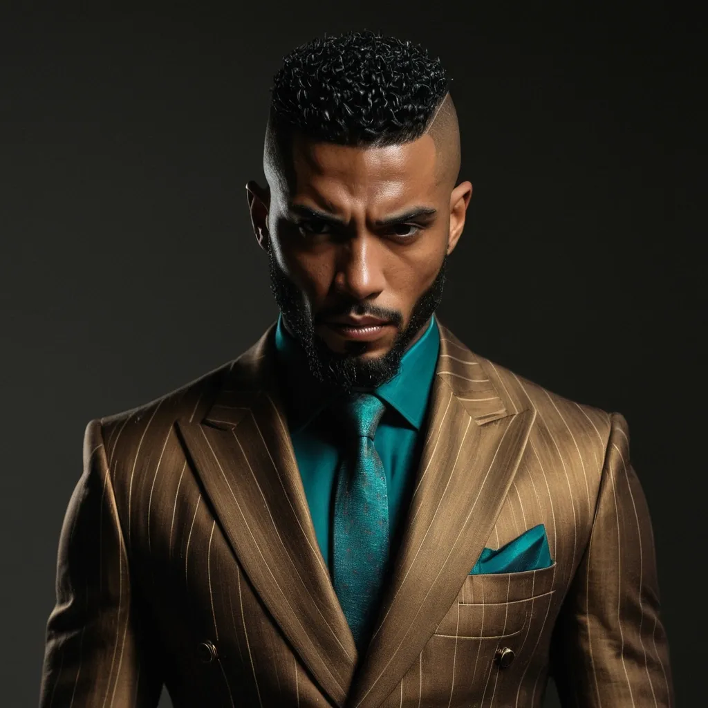 He is an gorgeous African American man with a striking , sculpted hairstyle that blends precision and edge. The sides of his head are shaved clean , while the top is left textured and natural , short curls forming a controlled crown. A sleek metallic band arcs across his hairline like a deliberate accent rather than decoration , reinforcing a sense of discipline and intent. His face is intense and angular , brow slightly furrowed , eyes cast downward with focused restraint , as if he’s thinking several moves ahead. His build is powerful but refined—broad through the shoulders , solid through the chest , and carried with an upright , composed posture. This is not brute bulk , but strength honed and contained , the kind that comes from control rather than excess. A full , well-shaped beard frames his jaw and chin , dense and carefully groomed , adding gravity to his expression. The beard balances the sharp lines of his face , giving him a presence that feels authoritative and unyielding. He wears a tailored , futuristic suit in a rich bronze-gold tone , cut close to the body and threaded with subtle teal-lit seams that trace the structure of the garment. The jacket features sharp lapels , geometric insignia , and a precisely folded pocket square , paired with a dark shirt and textured tie beneath. The materials look heavy , expensive , and intentional—fashion built like armor. The scene around him is dim and atmospheric , washed in deep shadows with controlled highlights that skim across the fabric and his features , placing him in a quiet , cinematic space where power isn’t announced—it’s simply understood. ,