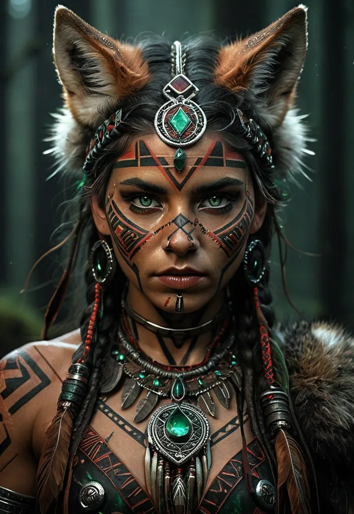 Hyper realistic portrait of a tribal warrior woman with an intense , piercing gaze and emerald green eyes that shine like gemstones. Her face is adorned with ritual paint in black and red tones , featuring geometric patterns and runic symbols that evoke ancestral power. Her hair is braided and interwoven with metallic rings , and she wears a fur-textured crown or headdress resembling wolf or fox pelt , reinforcing her connection to nature and her spirit animal. The lighting highlights the makeup details and skin texture , creating a dramatic and mystical atmosphere. The background is dark and blurred , drawing full attention to her face , which radiates strength , wisdom , and determination. Artistic style: magical realism with influences from Nordic tribal art and epic cinematography. ,