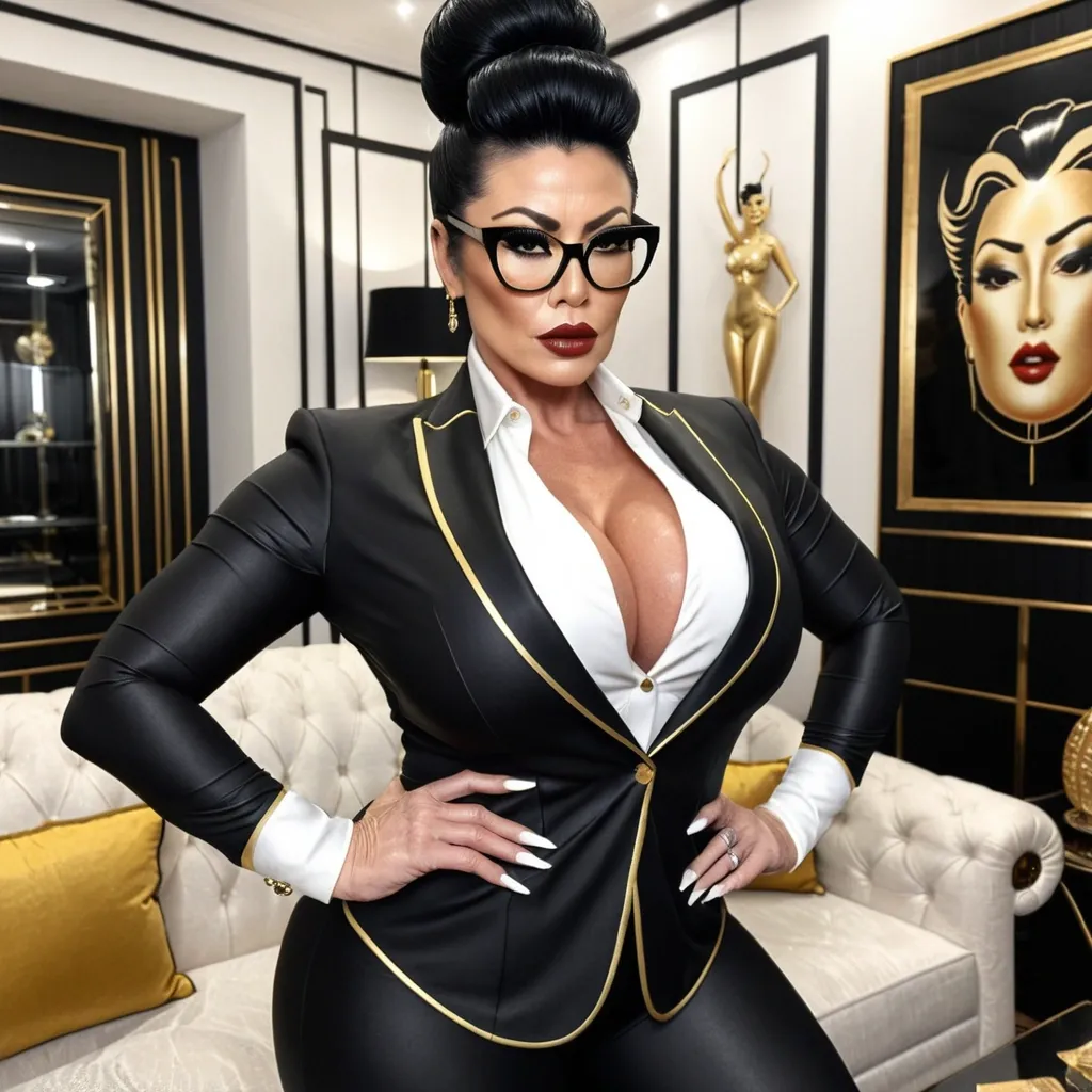 Generate Gorgeous female boss , 40 years old , bimbo , Japanese woman , hourglass body , abnormally massive female bodybuilder , gorgeous , close up , full lips , big booty , black hair , circle eyeglasses , pompadour updo hair style , feminine silhouette , too big breast , big booty , sexy thighs abs , silhouette , up close , flexing biceps , beautiful brown eyes , legs are iconic and defining physical feature , both visually and in terms of combat ability.wearing an outfit that is a striking blend of elegance , power , and femininity , designed to command attention in any room. The suit is tailored to perfection , hugging the wearer’s curves with precision while emphasizing a structured silhouette. The fabric itself is a refined grey tweed patterned with subtle white grid lines , giving the suit a texture that feels both sophisticated and modern. The blazer features broad blue lapels and gold button accents , adding a luxurious touch that elevates the look beyond typical business attire. The matching high-waisted trousers elongate the frame , further enhancing the poised and commanding effect of the ensemble.The styling choices amplify the boldness of the suit. The inner blouse is a silky , greybutton-down shirt that complements the tweed’s tone while introducing a softer , feminine balance to the sharp tailoring of the jacket. The blouse peeks out neatly from under the blazer , maintaining elegance without drawing focus away from the suit’s commanding cut. Accessories are kept minimal yet intentional: a delicate layered gold necklace and hoop earrings that add glimmers of light and luxury without overpowering the outfit. The choice of voluminous , honey-brown braids cascading down her shoulders frames the face with both confidence and glamour , completing the commanding visual.Altogether , this look communicates a blend of authority and allure. It is business-ready yet fashion-forward , balancing corporate structure with vibrant femininity. The color palette blue , grey and gold avoids being overly delicate , instead embracing the richness of texture , structure , and presence. This is the kind of ensemble that speaks to ambition , sophistication , and personal style—ideal for someone who thrives in positions of influence but insists on expressing her individuality with bold elegance. It’s not just clothing—it’s a statement of power wrapped in grace. In luxury living legs that could crush a watermelon , skirt high boots are a bold and striking statement piece , crafted in glossy black patent leather that gives them a sleek , polished finish. Rising to just below the knee , the boots feature three adjustable buckle straps along the shaft , adding both edge and detail to their design. The towering stiletto heel , paired with a thick platform sole , creates an ultra-dramatic silhouette that elongates the leg and exudes power and confidence. With their combination of shine , height , and structure , these boots perfectly balance fierce femininity with high-fashion allure. Enormous breast , , Up close shot , black and gold blazer , and white blouse full body shot in art-deco , noir style living room ,