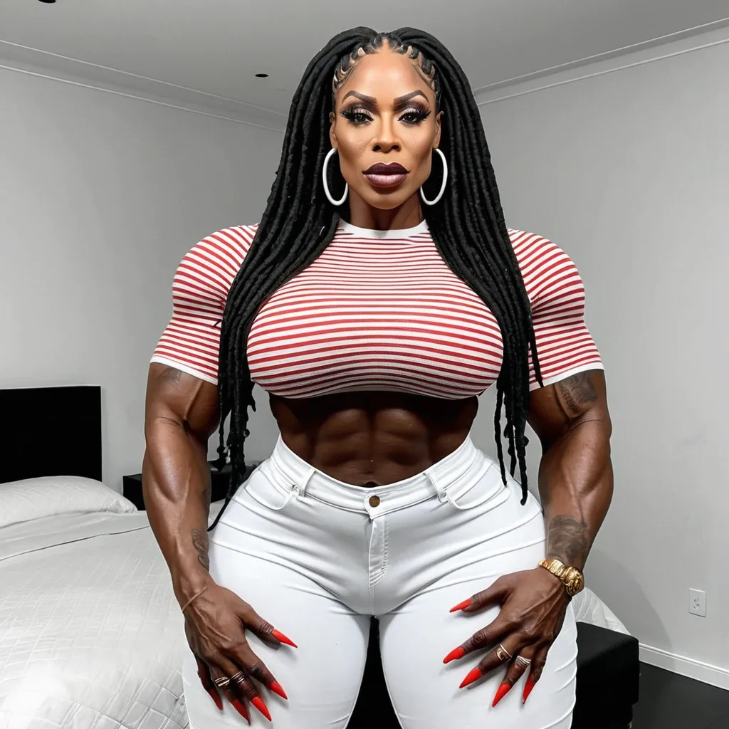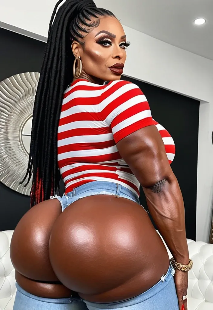 Generate Gorgeous female boss , bimbo , 47 years old , very dark-skinned African-American woman , , gorgeous hazel eyes , hourglass body , abnormally massive female bodybuilder , gorgeous , close up , full lips , big booty , dreadlocks , feminine silhouette , too big breast , big booty , sexy thighs abs , silhouette , up close , flexing biceps , beautiful hazel eyes , legs are iconic and defining physical feature , both visually and in terms of combat ability.wearing an outfit that is a striking blend of elegance , power , and femininity , designed to command attention in any room. The suit is tailored to perfection , hugging the wearer’s curves with precision while emphasizing a structured silhouette. The fabric itself is a refined grey tweed patterned with subtle white grid lines , giving the suit a texture that feels both sophisticated and modern. The blazer features broad blue lapels and gold button accents , adding a luxurious touch that elevates the look beyond typical business attire. The matching high-waisted trousers elongate the frame , further enhancing the poised and commanding effect of the ensemble.The styling choices amplify the boldness of the suit. The inner blouse is a silky , greybutton-down shirt that complements the tweed’s tone while introducing a softer , feminine balance to the sharp tailoring of the jacket. The blouse peeks out neatly from under the blazer , maintaining elegance without drawing focus away from the suit’s commanding cut. Accessories are kept minimal yet intentional: a delicate layered gold necklace and hoop earrings that add glimmers of light and luxury without overpowering the outfit. The choice of voluminous , honey-brown braids cascading down her shoulders frames the face with both confidence and glamour , completing the commanding visual.Altogether , this look communicates a blend of authority and allure. It is business-ready yet fashion-forward , balancing corporate structure with vibrant femininity. The color palette blue , grey and gold avoids being overly delicate , instead embracing the richness of texture , structure , and presence. This is the kind of ensemble that speaks to ambition , sophistication , and personal style—ideal for someone who thrives in positions of influence but insists on expressing her individuality with bold elegance. It’s not just clothing—it’s a statement of power wrapped in grace. In luxury living legs that could crush a watermelon , skirt high boots are a bold and striking statement piece , crafted in glossy black patent leather that gives them a sleek , polished finish. Rising to just below the knee , the boots feature three adjustable buckle straps along the shaft , adding both edge and detail to their design. The towering stiletto heel , paired with a thick platform sole , creates an ultra-dramatic silhouette that elongates the leg and exudes power and confidence. With their combination of shine , height , and structure , these boots perfectly balance fierce femininity with high-fashion allure. High cheekbones , prominent jawline , gorgeous big hazel honey eyes , , enormous breast , white and red and white striped t-shirt , and grepay denim pants , enormous butt , big round booty , enormous butt , thunder thighs and hips ,