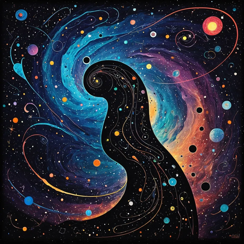 A surreal , abstract depiction of a Predator's silhouette formed from swirling cosmic dust and starlight. Within its form , miniature galaxies and celestial phenomena are visible. The background is a deep , infinite expanse of space , punctuated by glowing celestial patterns. The style is abstract and ethereal , drawing inspiration from the cosmic surrealism of artists like Joan Miró and Wassily Kandinsky , with a focus on vibrant , otherworldly colors. ,