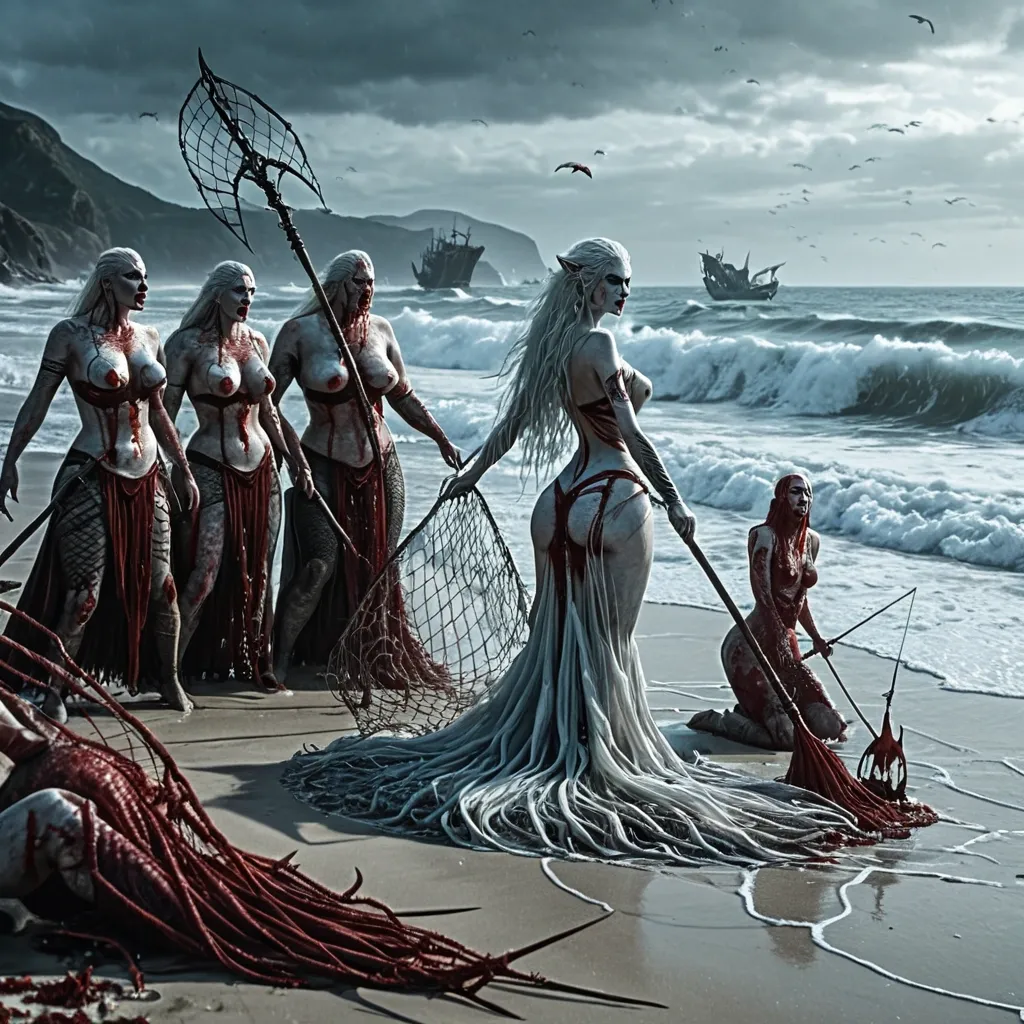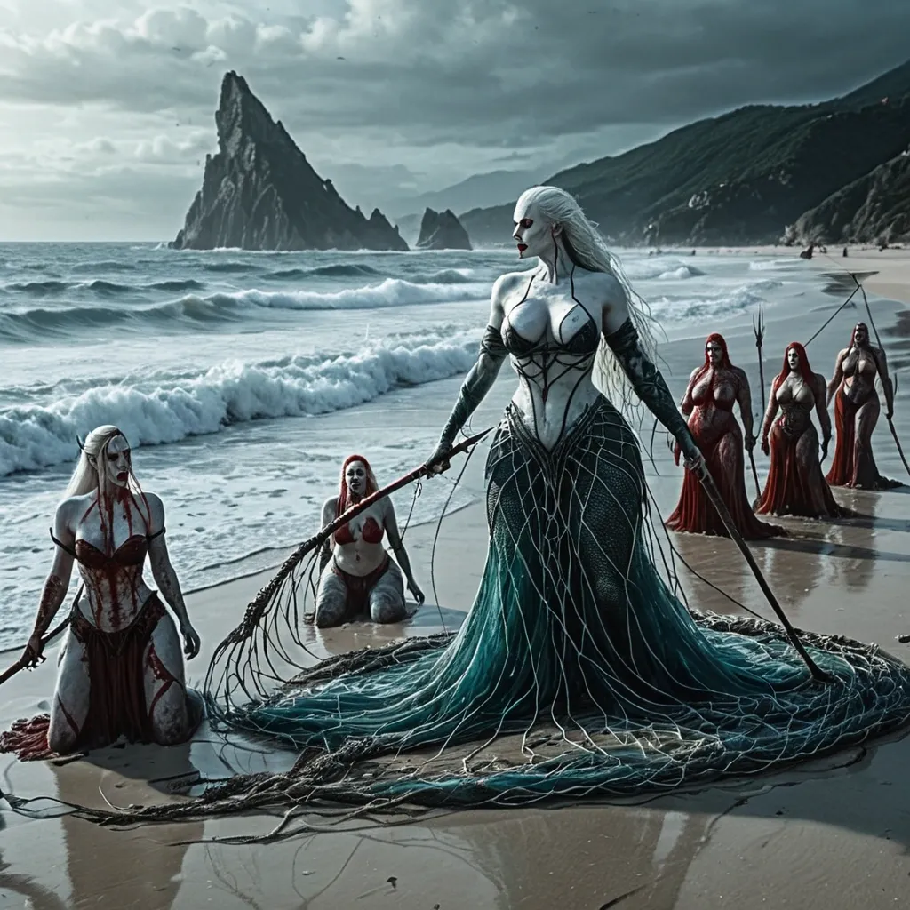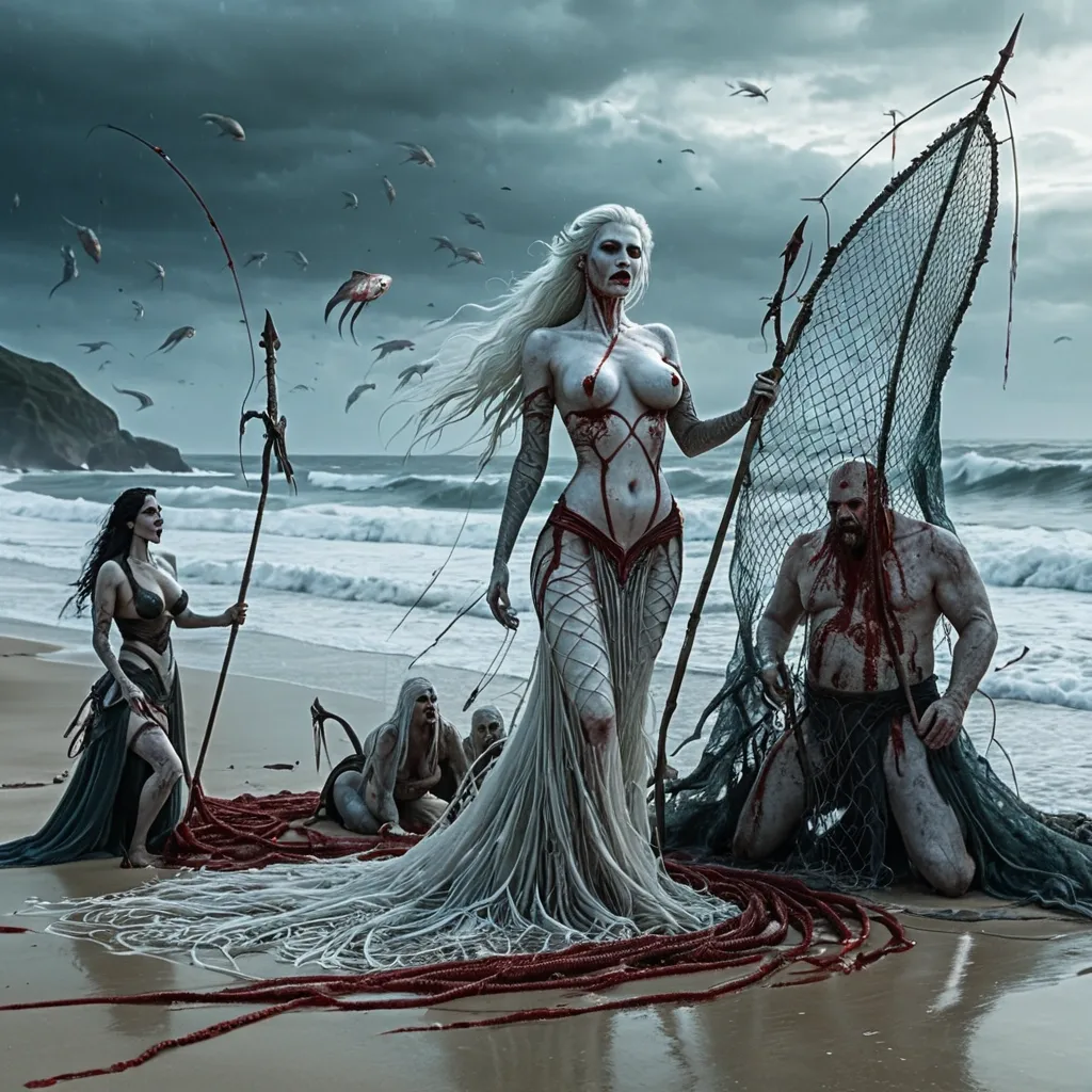 Cinematic fantasy artwork of a giant mermaid mother with pale white skin and a fish-like tail , trapped in a large fishing net on the sandy beach. Her mouth and side are bleeding slightly , red blood contrasting against her pale skin. Around her are several small baby mermaids with human-like upper bodies and fish tails , crawling on the sand near her , looking distressed. A group of fishermen surrounds them with spears and nets , standing cautiously on the beach. Ocean waves in the background , dramatic and surreal atmosphere , ultra-detailed , 8K cinematic fantasy art. ,