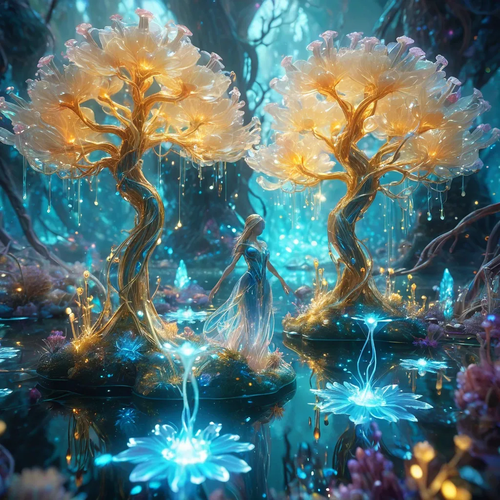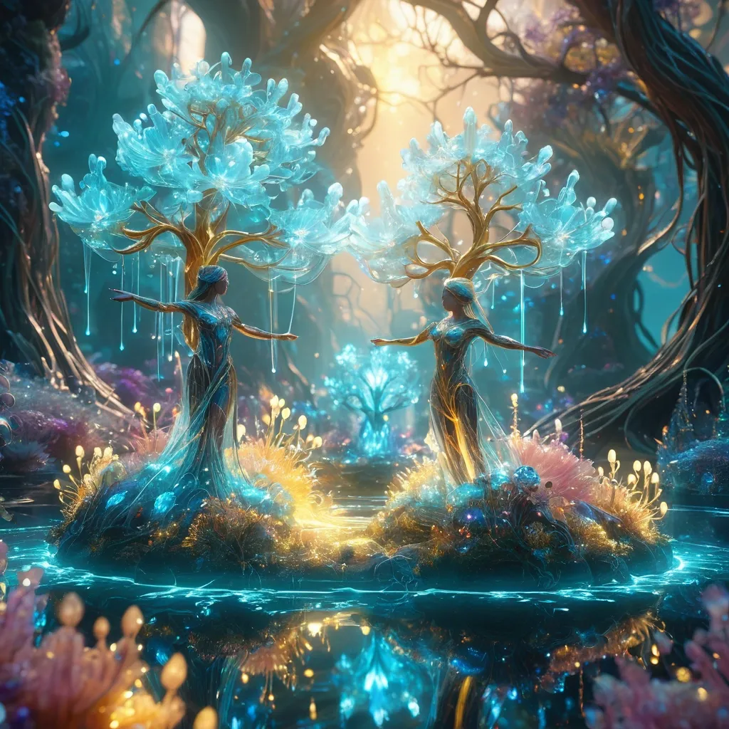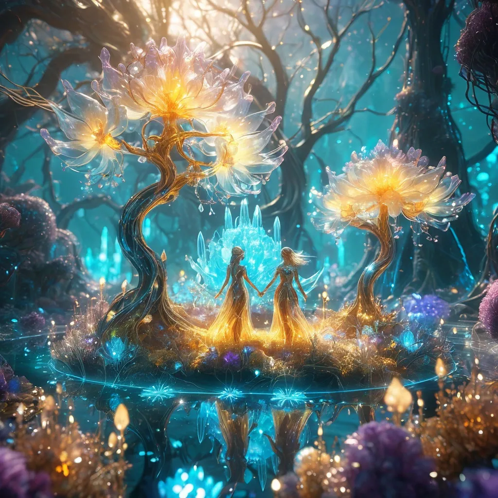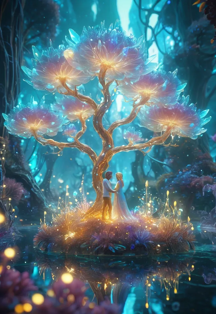 Healing Masterpiece "ethereal crystal garden with glowing flora , bioluminescent trees , floating islands , golden light filaments connecting dancing natural nativenbeautiful couple , fantasy art style , vibrant colors , magical realism , detailed crystal structures , soft focus , 8k , no mutation , no ugly , octane render ,