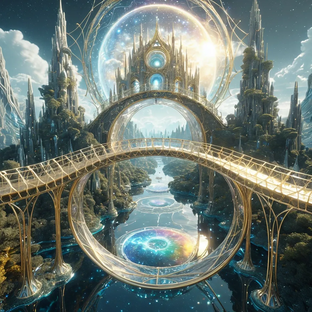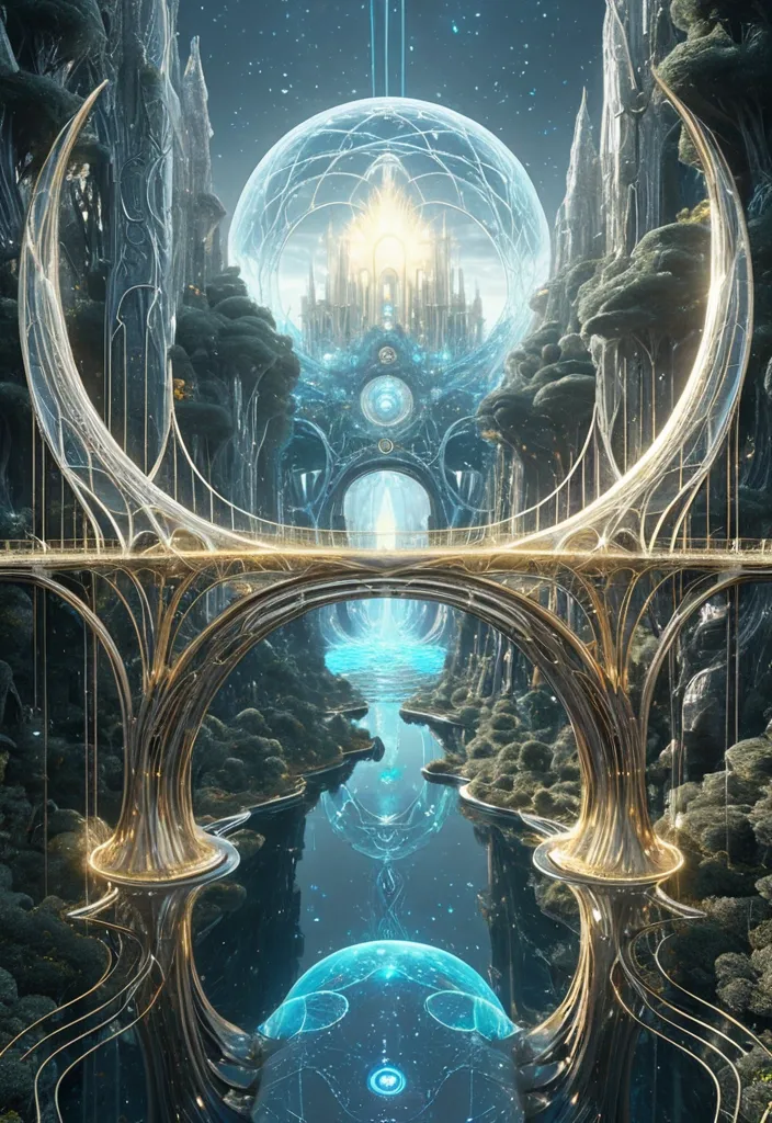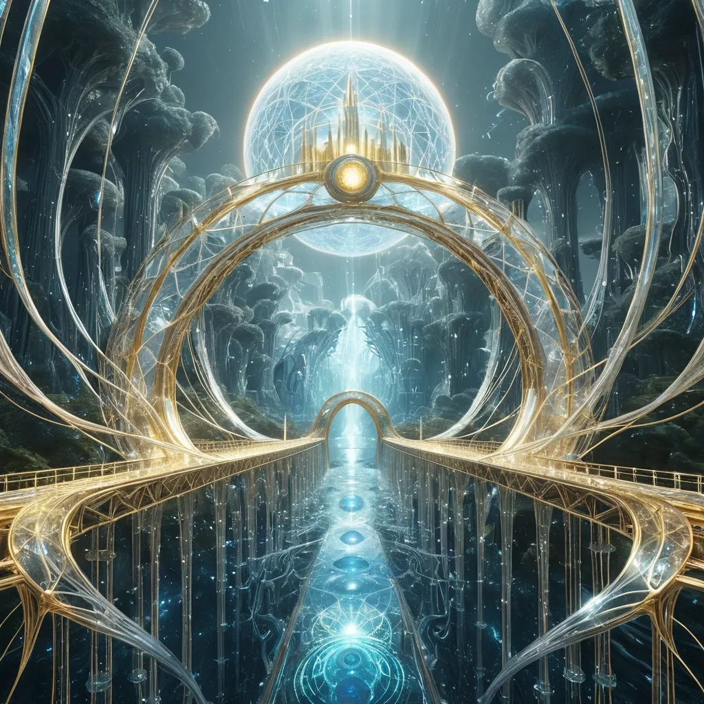 "Masterpiece: Eine lichtdurchflutete androgyne Gestalt mit Haaren aus fließendem klaren Kristall , in Roben aus goldenem und violettem Licht. Hält ein pulsierendes Kristallherz , von dem Sanskrit- , Ogham- und hebräische Schriftzeichen ausstrahlen. Im Hintergrund verschmelzen uralte und futuristische Architekturen im Regenbogen der Liebe. Detailreich , mystisch , hyperrealistisch , 8K , octane render" no Mutation , no ugly ,