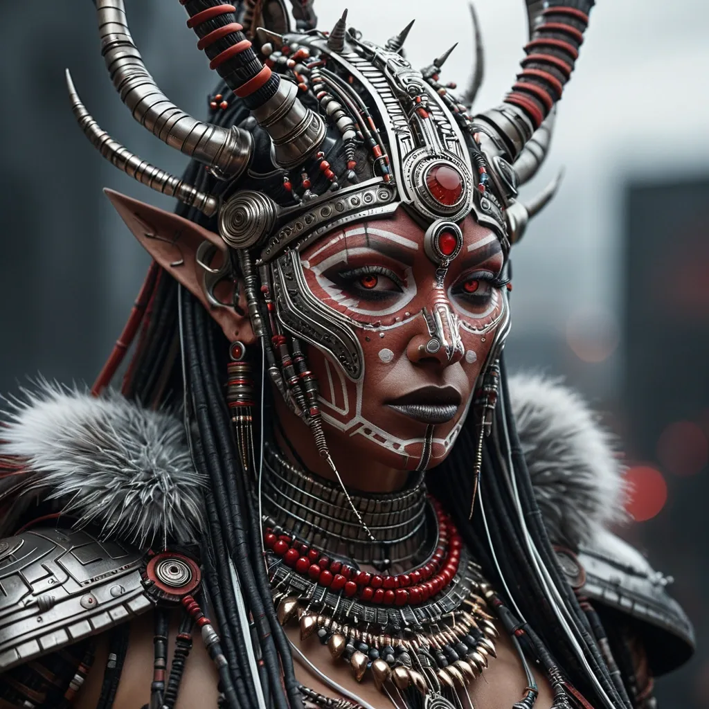 ultra detailed photo-realistic portrait of a tribal warrior with a cyber-organic aesthetic. she wears an elaborate horned headdress made of bone and aged metal , decorated with beads and hanging ornaments. her skin is extremely realistic: visible pores , imperfections , natural texture , no CGI look. subtle cybernetic details on the face: thin metallic lines and micro implants. her neck is clearly cybernetic: exposed mechanical structure with articulated metal segments , cables and connectors , realistically integrated with the skin. outfit: tribal and futuristic mix with fur cloak , layered necklaces and a central red gemstone. color palette: muted tones , bone white , aged metal , soft greys , with red and gold accents. lighting: soft natural light , realistic shadows emphasizing skin and metal. style: cinematic photography , 85mm lens , shallow depth of field , ultra realistic , no cartoon ,