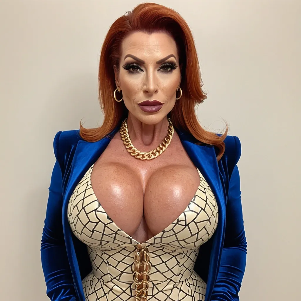 Generate a Gorgeous 42 year old female boss , bimbo , hourglass body , abnormally massive female bodybuilder , gorgeous , close up , full lips , big booty , redheaded , eyeliner , lips gloss , freckles on face and breast , pompadour updo design hair , feminine silhouette , too big breast , big booty , sexy thighs abs , silhouette , up close , flexing biceps , beautiful green eyes , legs are iconic and defining physical feature , both visually and in terms of combat ability.wearing an outfit that is a striking blend of elegance , power , and femininity , designed to command attention in any room. The suit is tailored to perfection , hugging the wearer’s curves with precision while emphasizing a structured silhouette. The fabric itself is a refined grey tweed patterned with subtle white grid lines , giving the suit a texture that feels both sophisticated and modern. The blazer features broad blue lapels and gold button accents , adding a luxurious touch that elevates the look beyond typical business attire. The matching high-waisted trousers elongate the frame , further enhancing the poised and commanding effect of the ensemble.The styling choices amplify the boldness of the suit. The inner blouse is a silky , greybutton-down shirt that complements the tweed’s tone while introducing a softer , feminine balance to the sharp tailoring of the jacket. The blouse peeks out neatly from under the blazer , maintaining elegance without drawing focus away from the suit’s commanding cut. Accessories are kept minimal yet intentional: a delicate layered gold necklace and hoop earrings that add glimmers of light and luxury without overpowering the outfit. The choice of voluminous , honey-brown braids cascading down her shoulders frames the face with both confidence and glamour , completing the commanding visual.Altogether , this look communicates a blend of authority and allure. It is business-ready yet fashion-forward , balancing corporate structure with vibrant femininity. The color palette blue , grey and gold avoids being overly delicate , instead embracing the richness of texture , structure , and presence. This is the kind of ensemble that speaks to ambition , sophistication , and personal style—ideal for someone who thrives in positions of influence but insists on expressing her individuality with bold elegance. It’s not just clothing—it’s a statement of power wrapped in grace. In luxury living legs that could crush a watermelon , skirt high boots are a bold and striking statement piece , crafted in glossy black patent leather that gives them a sleek , polished finish. Rising to just below the knee , the boots feature three adjustable buckle straps along the shaft , adding both edge and detail to their design. The towering stiletto heel , paired with a thick platform sole , creates an ultra-dramatic silhouette that elongates the leg and exudes power and confidence. With their combination of shine , height , and structure , these boots perfectly balance fierce femininity with high-fashion allure. Massive breast , massive cleavage , Up close shot blue velvet blazer , black leather color , beige blouse underneath , gold tiny chain necklace , , blue velvet blazer , black leather color , beige blouse underneath , gold tiny chain necklace , beige pattern designed dress t-ahirt , massive cleavage ,
