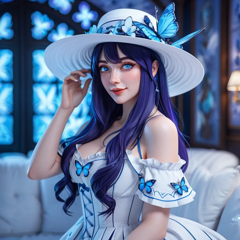 Masterpiece , best quality , highres , cinematic lighting , portrait of a beautiful anime girl , dark purple hair with light blue inner-layer highlights , large expressive light blue eyes , soft smile , wearing a white boater hat with a large blue butterfly ornament , wearing a white off-the-shoulder ruffled dress with blue straps and butterfly motifs , soft indoor lighting , blurred background , detailed eyes , vibrant colors , fine lines. ,