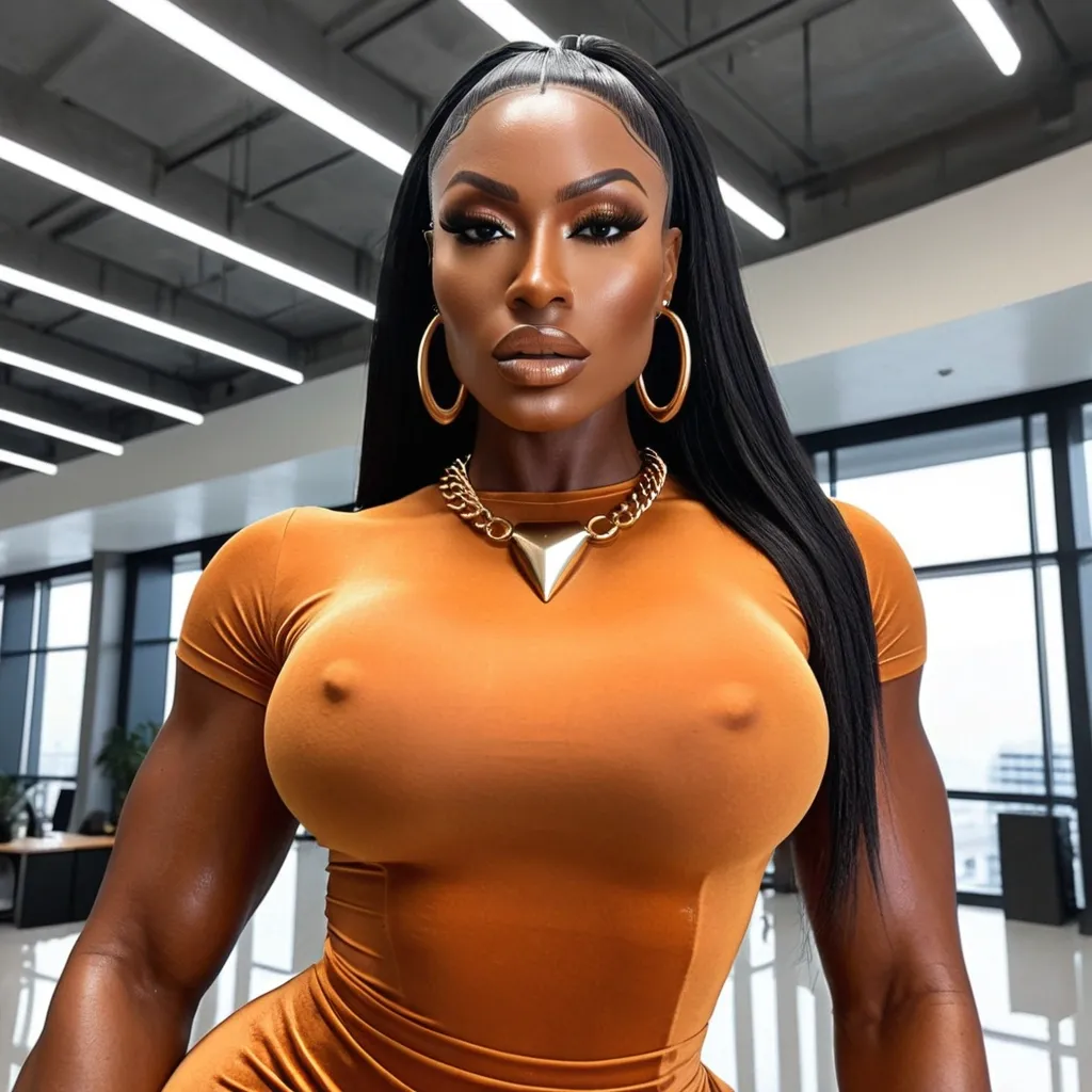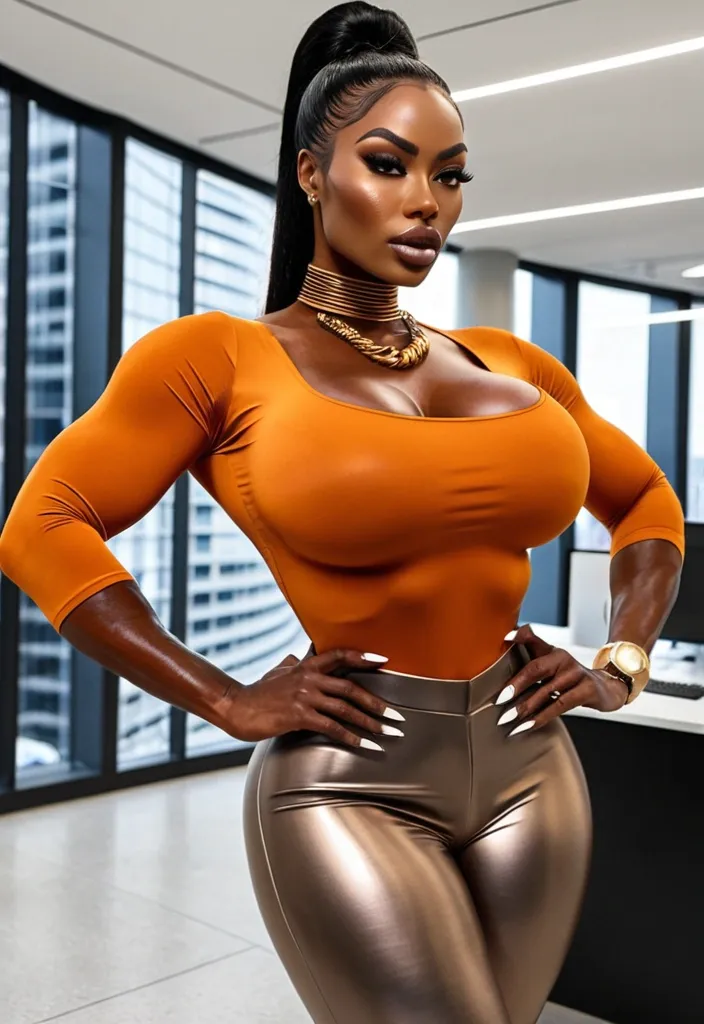 Generate Gorgeous 24 years old , female boss , dark-skinned African-American woman , pointy face , bimbo , hourglass body , abnormally massive female bodybuilder , gorgeous , close up , full lips , big booty , short stylish futuristic mini afro , feminine silhouette , too big breast , big booty , sexy thighs abs , silhouette , up close , flexing biceps , beautiful brown eyes , legs are iconic and defining physical feature , both visually and in terms of combat ability.wearing an outfit that is a striking blend of elegance , power , and femininity , designed to command attention in any room. The suit is tailored to perfection , hugging the wearer’s curves with precision while emphasizing a structured silhouette. The fabric itself is a refined grey tweed patterned with subtle white grid lines , giving the suit a texture that feels both sophisticated and modern. The blazer features broad blue lapels and gold button accents , adding a luxurious touch that elevates the look beyond typical business attire. The matching high-waisted trousers elongate the frame , further enhancing the poised and commanding effect of the ensemble.The styling choices amplify the boldness of the suit. The inner blouse is a silky , greybutton-down shirt that complements the tweed’s tone while introducing a softer , feminine balance to the sharp tailoring of the jacket. The blouse peeks out neatly from under the blazer , maintaining elegance without drawing focus away from the suit’s commanding cut. Accessories are kept minimal yet intentional: a delicate layered gold necklace and hoop earrings that add glimmers of light and luxury without overpowering the outfit. The choice of voluminous , honey-brown braids cascading down her shoulders frames the face with both confidence and glamour , completing the commanding visual.Altogether , this look communicates a blend of authority and allure. It is business-ready yet fashion-forward , balancing corporate structure with vibrant femininity. The color palette blue , grey and gold avoids being overly delicate , instead embracing the richness of texture , structure , and presence. This is the kind of ensemble that speaks to ambition , sophistication , and personal style—ideal for someone who thrives in positions of influence but insists on expressing her individuality with bold elegance. It’s not just clothing—it’s a statement of power wrapped in grace. In luxury living legs that could crush a watermelon , skirt high boots are a bold and striking statement piece , crafted in glossy black patent leather that gives them a sleek , polished finish. Rising to just below the knee , the boots feature three adjustable buckle straps along the shaft , adding both edge and detail to their design. The towering stiletto heel , paired with a thick platform sole , creates an ultra-dramatic silhouette that elongates the leg and exudes power and confidence. With their combination of shine , height , and structure , these boots perfectly balance fierce femininity with high-fashion allure. High cheekbones , prominent jawline , gorgeous big brown light hazel honey , , enormous breast , orange velvet t-shirt , gold futuristic necklace , gray designer pants in office building ,