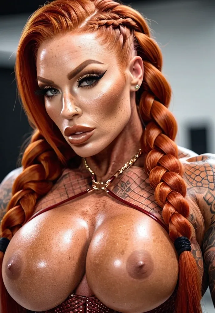 Generate Gorgeous female boss , bimbo , hourglass body , abnormally massive female bodybuilder , gorgeous , close up , full lips , big booty , redheaded , freckles on face and breast , braided design hair , feminine silhouette , too big breast , big booty , sexy thighs abs , silhouette , up close , flexing biceps , beautiful green eyes , legs are iconic and defining physical feature , both visually and in terms of combat ability.wearing an outfit that is a striking blend of elegance , power , and femininity , designed to command attention in any room. The suit is tailored to perfection , hugging the wearer’s curves with precision while emphasizing a structured silhouette. The fabric itself is a refined grey tweed patterned with subtle white grid lines , giving the suit a texture that feels both sophisticated and modern. The blazer features broad blue lapels and gold button accents , adding a luxurious touch that elevates the look beyond typical business attire. The matching high-waisted trousers elongate the frame , further enhancing the poised and commanding effect of the ensemble.The styling choices amplify the boldness of the suit. The inner blouse is a silky , greybutton-down shirt that complements the tweed’s tone while introducing a softer , feminine balance to the sharp tailoring of the jacket. The blouse peeks out neatly from under the blazer , maintaining elegance without drawing focus away from the suit’s commanding cut. Accessories are kept minimal yet intentional: a delicate layered gold necklace and hoop earrings that add glimmers of light and luxury without overpowering the outfit. The choice of voluminous , honey-brown braids cascading down her shoulders frames the face with both confidence and glamour , completing the commanding visual.Altogether , this look communicates a blend of authority and allure. It is business-ready yet fashion-forward , balancing corporate structure with vibrant femininity. The color palette blue , grey and gold avoids being overly delicate , instead embracing the richness of texture , structure , and presence. This is the kind of ensemble that speaks to ambition , sophistication , and personal style—ideal for someone who thrives in positions of influence but insists on expressing her individuality with bold elegance. It’s not just clothing—it’s a statement of power wrapped in grace. In luxury living legs that could crush a watermelon , skirt high boots are a bold and striking statement piece , crafted in glossy black patent leather that gives them a sleek , polished finish. Rising to just below the knee , the boots feature three adjustable buckle straps along the shaft , adding both edge and detail to their design. The towering stiletto heel , paired with a thick platform sole , creates an ultra-dramatic silhouette that elongates the leg and exudes power and confidence. With their combination of shine , height , and structure , these boots perfectly balance fierce femininity with high-fashion allure. ,