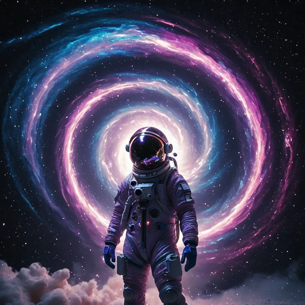 Show a swirling galaxy in space , with bright stars and dust clouds forming a colorful vortex. a lonely astronaut (modern space suits , reflective helmets , no visible faces) formed from swirling stardust , fly a vast vortex , shrouded in dark black like doted surreal. Light sparkles and shifts as the galactic core emits a gentle glow , highlighting shades of blue , purple , and pink , with stars twinkling in the distance. Style: Celestial , ethereal , vortex , digital art smoking: Dramatic backlighting , bright glowing particles , contrasting dark background Composition: dynamic diagonal composition , upward gaze Details: Sparkling white waves and smoke , streaking white light trails , sense of movement and wonder , magical atmosphere Quality: High detail , 4K , Masterpiece , Rendered in Octane. ,