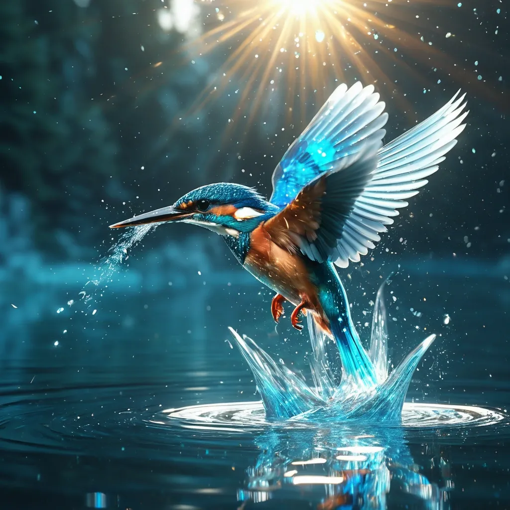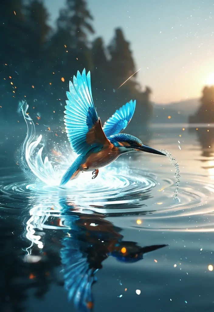 A kingfisher gracefully takes flight from blue water , its vibrant plumage glistening in the morning light , The bird soars through the air with effortless grace , its wings beating rhythmically , The water below mirrors the beauty above. Style: Celestial , ethereal , vortex , digital art smoking: Dramatic backlighting , bright glowing particles , contrasting lake background Composition: dynamic diagonal composition , upward gaze Details: Sparkling drops and water particles , streaking white light trails , sense of movement and wonder , magical atmosphere Quality: High detail , 4K , Masterpiece , Rendered in Octane. ,