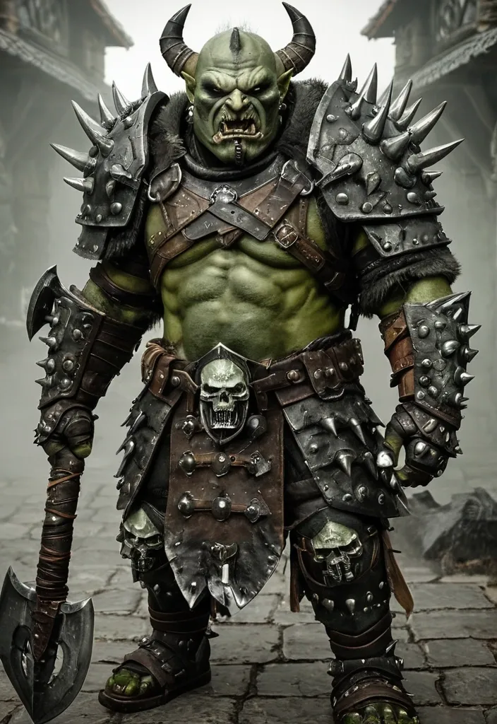Орк (Orc) Общее: Массивные , с зеленой/серой кожей , клыками , шрамами. Доспехи составлены из трофеев и грубых материалов. Воин-Дамагер (Warrior-Damager): Доспех: Кожаные и костяные латы , часто с шипами. На плечах — черепа или рога. Оружие: «Топор Раздора» (Двуручный топор) — огромный топор с двойным лезвием , насаженный на древко , обтянутое кожей. Клинки зазубрены. ,