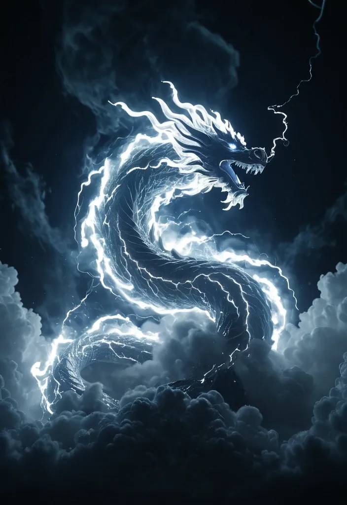 A storm cloud shaped like a dragon , breathing lightning instead of fire. Style: Celestial , ethereal , vortex , digital art smoking: Dramatic backlighting , bright glowing particles , contrasting dark background Composition: dynamic diagonal composition , upward gaze Details: Sparkling white waves and smoke , streaking white light trails , sense of movement and wonder , magical atmosphere Quality: High detail , 4K , Masterpiece , Rendered in Octane. ,