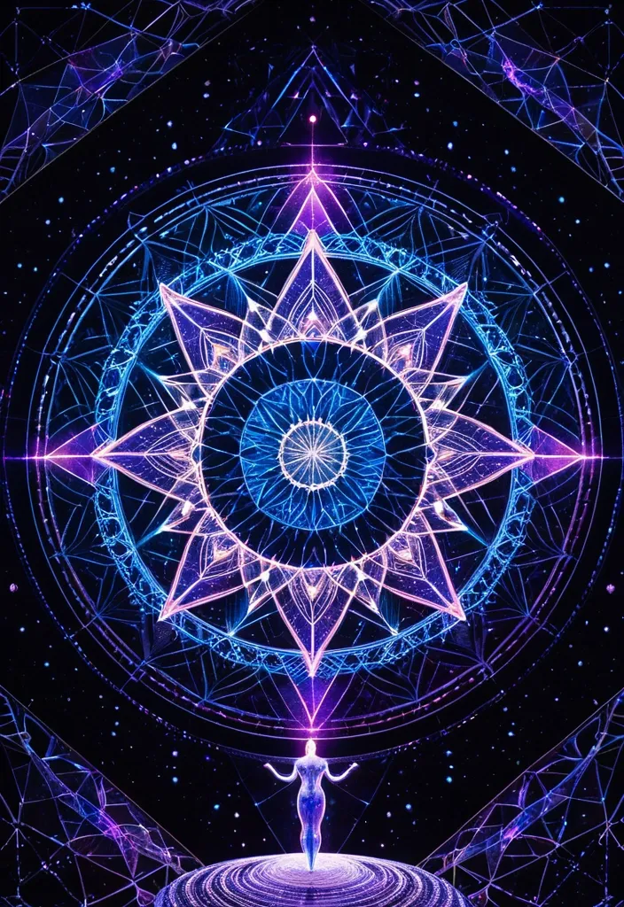 An aerial perspective looking down at a single human figure standing at the exact center of an intricate sacred geometry mandala drawn in light on a dark mirror-like surface. The mandala radiates outward in concentric rings of luminous white , electric blue and deep magenta , each ring more complex than the last. The figure is small but perfectly centered — calm , still , powerful. Around the outer edges of the mandala , the surface dissolves into stars and deep space. The contrast between the geometric order at the center and the infinite cosmos at the edges creates a feeling of being simultaneously grounded and boundless. Ultra-wide lens distortion at edges. Bioluminescent glow quality.- Energy flow: • Truth current: Diamond-light beams piercing illusions • Harmony wave: Violet mist dissolving sharp edges - Background: Holographic Schwarzwald merging with nebula , trees made of starlight and silence - Sacred details: » Stork's eye contains rotating galaxy with "Sein" written in light » Cannabis trichomes refracting truth-light into rainbow prisms » Coffee bean cracks revealing microscopic mandalas - Style: Micro/macro cosmic realism , Esao Andrews meets Hubble photography - Light alchemy: » Bioluminescent truth (wavelength 540nm) » Phosphorescent harmony (wavelength 420nm) » Unified glow where spectrums merge (golden-white) --ar 1:1 --detail 32k --quantum_healing ,