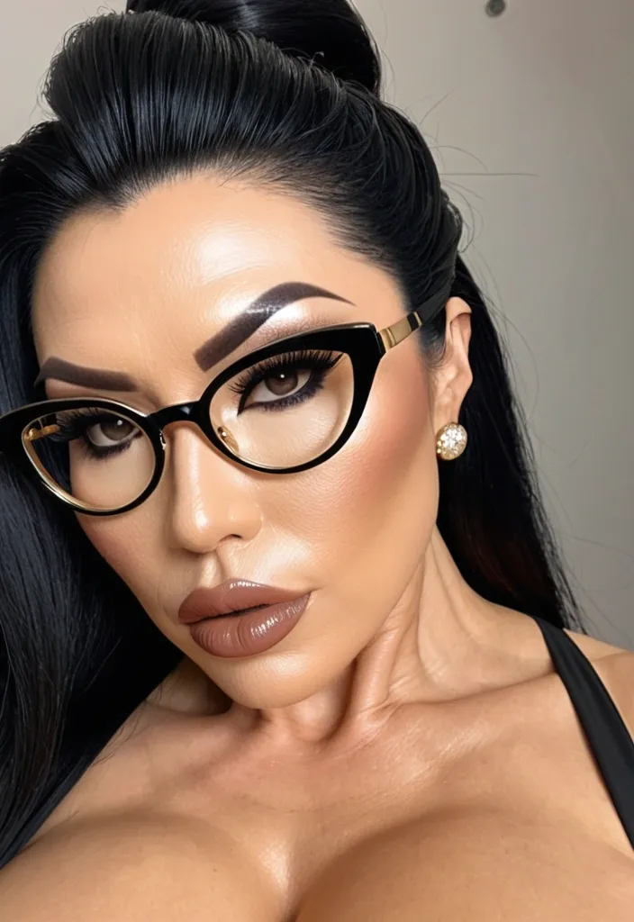 Japanese woman , Generate Gorgeous female boss , bimbo , hourglass body , circle gold rimmed eye glasses , 42 years old , bushy eyebrows , high cheekbones , plump lips abnormally massive female bodybuilder , gorgeous , close up , full lips , big booty , black hair , pompadour design hair , feminine silhouette , too big breast , big booty , sexy thighs abs , silhouette , up close , flexing biceps , beautiful alluring brown eyes , legs are iconic and defining physical feature , both visually and in terms of combat ability.wearing an outfit that is a striking blend of elegance , power , and femininity , designed to command attention in any room. The suit is tailored to perfection , hugging the wearer’s curves with precision while emphasizing a structured silhouette. The fabric itself is a refined grey tweed patterned with subtle white grid lines , giving the suit a texture that feels both sophisticated and modern. The blazer features broad blue lapels and gold button accents , adding a luxurious touch that elevates the look beyond typical business attire. The matching high-waisted trousers elongate the frame , further enhancing the poised and commanding effect of the ensemble.The styling choices amplify the boldness of the suit. The inner blouse is a silky , greybutton-down shirt that complements the tweed’s tone while introducing a softer , feminine balance to the sharp tailoring of the jacket. The blouse peeks out neatly from under the blazer , maintaining elegance without drawing focus away from the suit’s commanding cut. Accessories are kept minimal yet intentional: a delicate layered gold necklace and hoop earrings that add glimmers of light and luxury without overpowering the outfit. The choice of voluminous , honey-brown braids cascading down her shoulders frames the face with both confidence and glamour , completing the commanding visual.Altogether , this look communicates a blend of authority and allure. It is business-ready yet fashion-forward , balancing corporate structure with vibrant femininity. The color palette blue , grey and gold avoids being overly delicate , instead embracing the richness of texture , structure , and presence. This is the kind of ensemble that speaks to ambition , sophistication , and personal style—ideal for someone who thrives in positions of influence but insists on expressing her individuality with bold elegance. It’s not just clothing—it’s a statement of power wrapped in grace. In luxury living legs that could crush a watermelon , skirt high boots are a bold and striking statement piece , crafted in glossy black patent leather that gives them a sleek , polished finish. Rising to just below the knee , the boots feature three adjustable buckle straps along the shaft , adding both edge and detail to their design. The towering stiletto heel , paired with a thick platform sole , creates an ultra-dramatic silhouette that elongates the leg and exudes power and confidence. With their combination of shine , height , and structure , these boots perfectly balance fierce femininity with high-fashion allure. ,