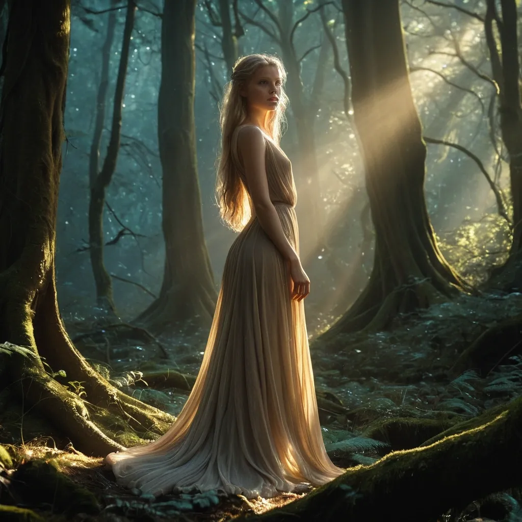 A breathtaking low wide-angle , hyperrealistic 8K ultra-high-definition cinematic photograph of an impossibly beautiful Dutch woman standing amidst a mystical , ancient forest reminiscent of 'The Lord of the Rings'. A single , brilliant shaft of golden light pierces through the dense , enchanted canopy , illuminating her with a divine , ethereal glow , creating dramatic shadows and highlights. Her face possesses a captivating blend of pristine innocence and profound delicate beauty , reflecting her pure and gentle essence. She has striking , crystal-clear blue eyes that hold an alluring mystery within their depth. Her features are distinctly Dutch , with fair , luminous skin that appears almost translucent in the soft forest light. Her long , flowing hair (e.g. , golden blonde or soft brown) cascades elegantly , catching the light and seeming to shimmer with an otherworldly quality. She is gracefully poised , clad in a subtle , ethereal garment (perhaps a soft , light-colored dress made of flowing fabric) that drapes beautifully and modestly over her form , highlighting her elegant silhouette. She exudes a deeply captivating and mysterious aura , her posture one of serene contemplation or gentle movement , perfectly integrated within the magical environment. The forest itself is vibrant and alive with luminous flora , ancient , gnarled trees , and a delicate , shimmering mist rising from the forest floor , all rendered with incredible detail and depth , enhancing the profound fantasy atmosphere. The low wide-angle shot emphasizes her majestic and enchanting presence against the grandeur of the forest , drawing the viewer's gaze from the lush foreground to her captivating figure. ,