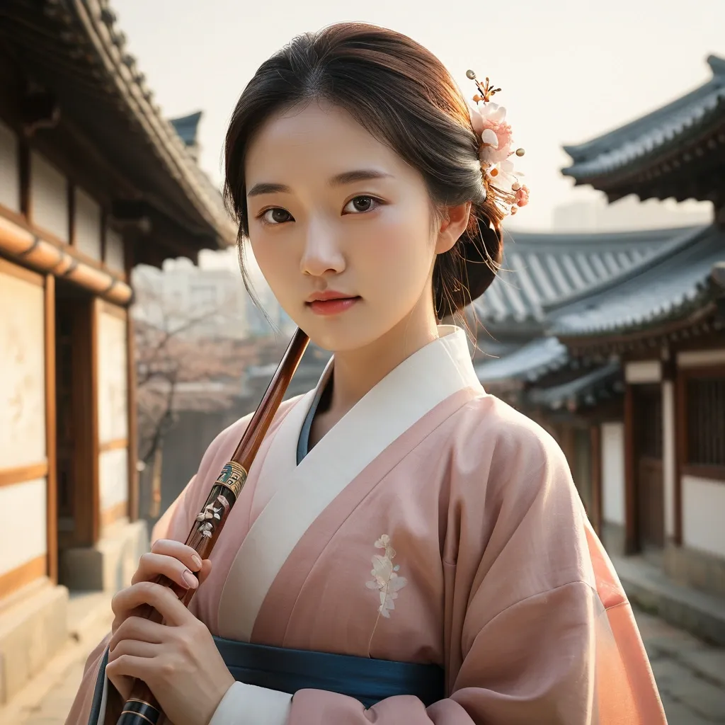 A captivating artistic rendering , like a classical Korean painting or a master's oil portrait , of an incredibly beautiful Korean woman. Her face , pure and delicate , is gently kissed by a bright , warm light that casts a soft , inviting glow upon her forehead and cheeks , imbuing her with a tender radiance. Her expression carries a blend of ethereal innocence , a touch of gentle vulnerability , and a subtly captivating charm that emanates from her deep , soulful eyes. She is elegantly dressed in a meticulously detailed traditional Joseon Dynasty Hanbok , adorned with soft , refined colors , and gracefully holds a classic Korean flute (피리) in her hands. The setting is an authentic Joseon Dynasty street scene , featuring quaint traditional wooden buildings with tiled roofs and perhaps a subtle hint of everyday life in the background , all bathed in a warm , diffused daylight. The composition is captured from a low wide-angle perspective , emphasizing her dignified yet gently vulnerable presence against the intricate historical cityscape. The art style should evoke the timeless beauty of traditional Korean aesthetics combined with classical painting techniques , using a gentle and warm color palette and delicate brushstrokes to create a scene of poetic tranquility and serene , yet alluring , beauty. ,