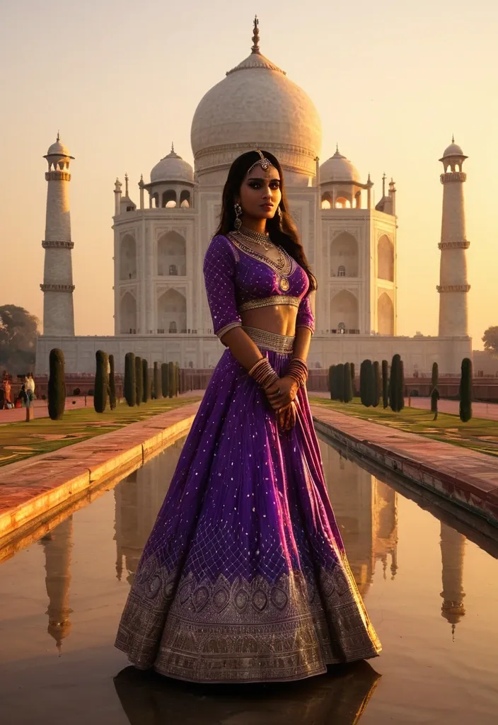 A breathtaking low wide-angle , hyperrealistic 8K ultra-high-definition cinematic photograph of a magnificent Indian woman set against the iconic , pristine white marble of the Taj Mahal at dawn or dusk. A single , powerful beam of golden sunlight strikes from behind , creating a dazzling silhouette effect that emphasizes the elegant contours of her intricate , traditional Indian attire. Her vibrant , jewel-toned garment is richly detailed , yet designed to create a striking , captivating silhouette against the luminous background of the Taj Mahal. Her face is beautifully innocent and radiant , exuding a serene and pure expression. Her most striking features are her captivating , luminous purple eyes , which sparkle with an ethereal glow , holding a deep , contemplative and utterly enchanting gaze. Her facial features retain a distinctly Indian elegance and charm , harmoniously blending with her pristine aesthetic. Her elaborate jewelry and flowing dark hair are caught by the light , adding to her ethereal aura. The Taj Mahal looms grandly in the background , its exquisite Mughal architecture and majestic dome bathed in the soft , magical light of the golden hour. The reflection of the monument in the surrounding water features (if applicable) adds to the dreamlike quality. The low wide-angle perspective elevates both the woman and the monument , making them appear awe-inspiring and timeless , blending reality with fantastical splendor. The atmosphere is calm yet imbued with a sense of profound beauty , cultural richness , and an otherworldly grace. ,