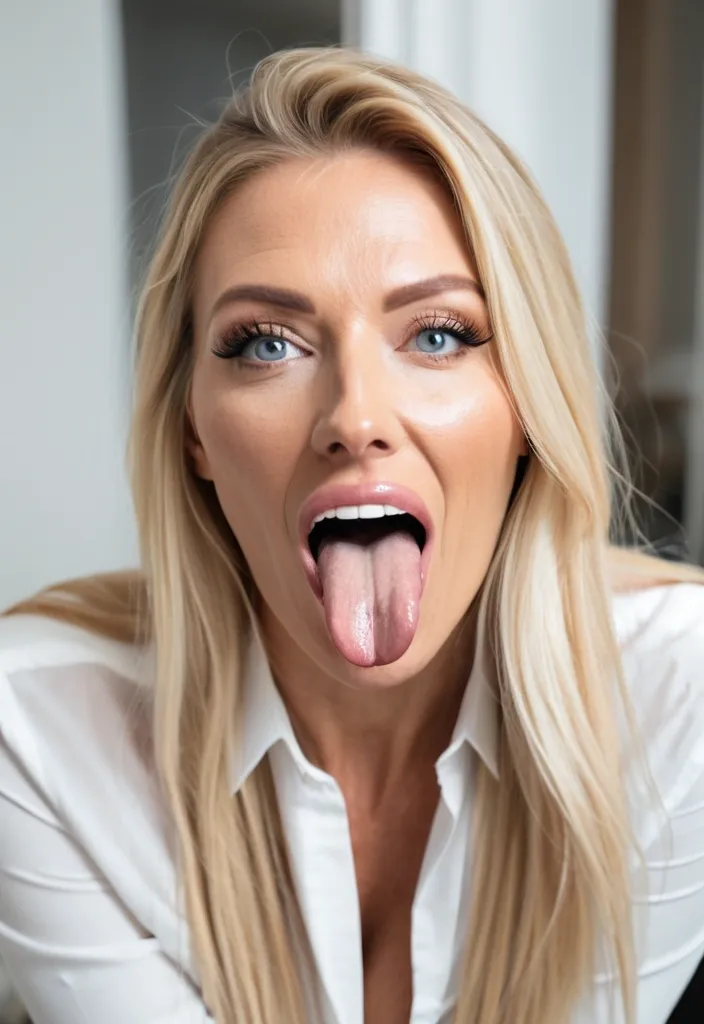 A young woman with long blonde hair , dressed in a white shirt , sits indoors with a playful and mischievous expression. She delicately sticks out her tongue with a slight smile , displaying a tender yet provocative look. The camera remains fixed in a frontal view , focusing on the woman's face for a clear depiction of the tongue movement. ,