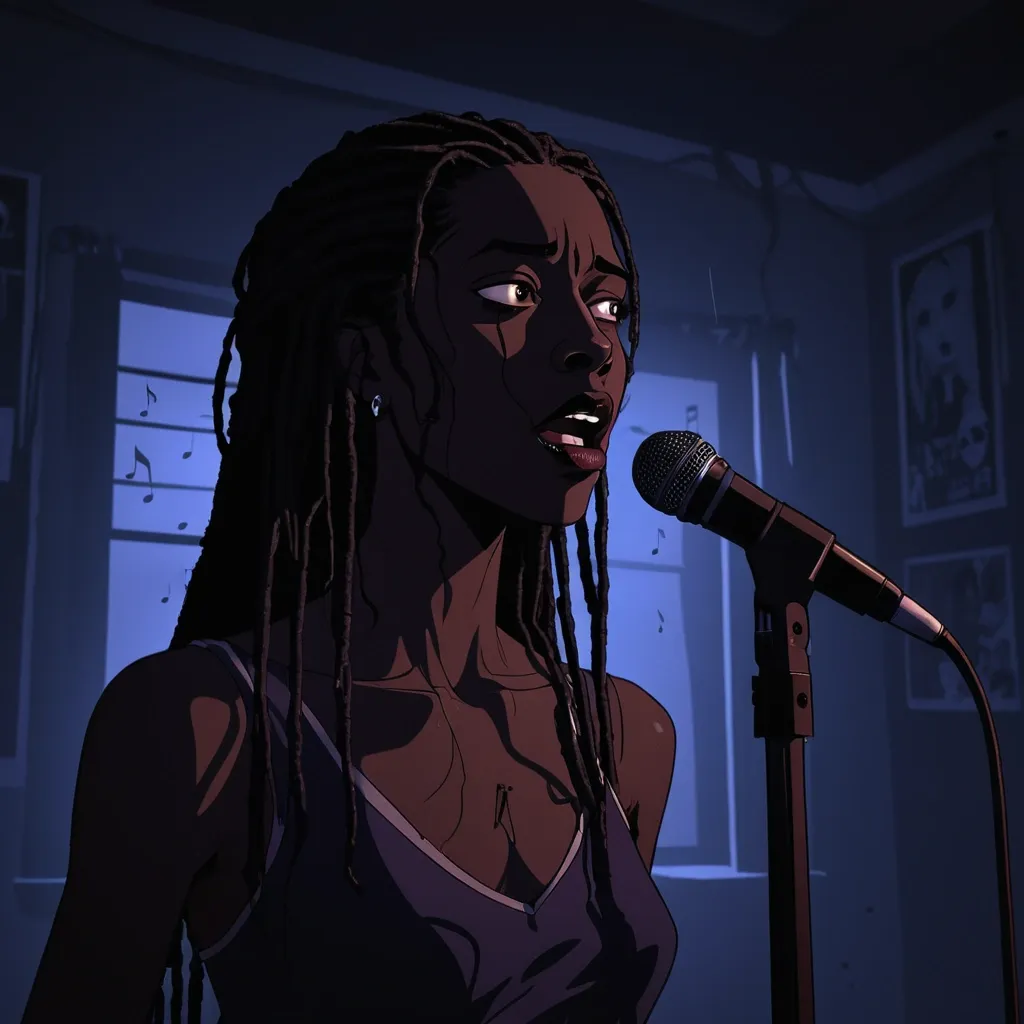 A slender , graceful vampire , appearing in her late 20s to early 30s with dark skin , long dark dreadlocks , and striking eyes with a subtle reddish hue , sings with visible sadness in her expression. This illustration is rendered in a graphic novel style , with bold lines and dramatic shadows , reminiscent of Artstation illustrations. She sings in a dimly lit room , a single spotlight illuminating her face. A microphone stands before her , and musical notes float in the air around her. Her posture is melancholic , and her eyes are filled with longing. The overall color palette is muted and somber , with deep blues , purples , and blacks dominating , emphasizing her grief and the cathartic power of music. ,