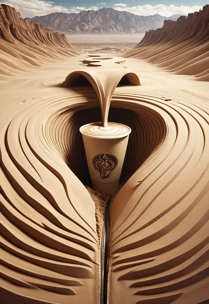 A vast expanse of a desert where the sand tornado form the shape of a giant coffee cup , half-buried beneath the sand split by a partially unzipped 'Y' shaped zipper. On the outside of the zipper , a mountain transitions into a waterfall that fall from cup and fills the structure of the coffee cup in a Interference style. Rendered in surreal symbolic illustration with interior revealed by the unzipping above showcases. ,