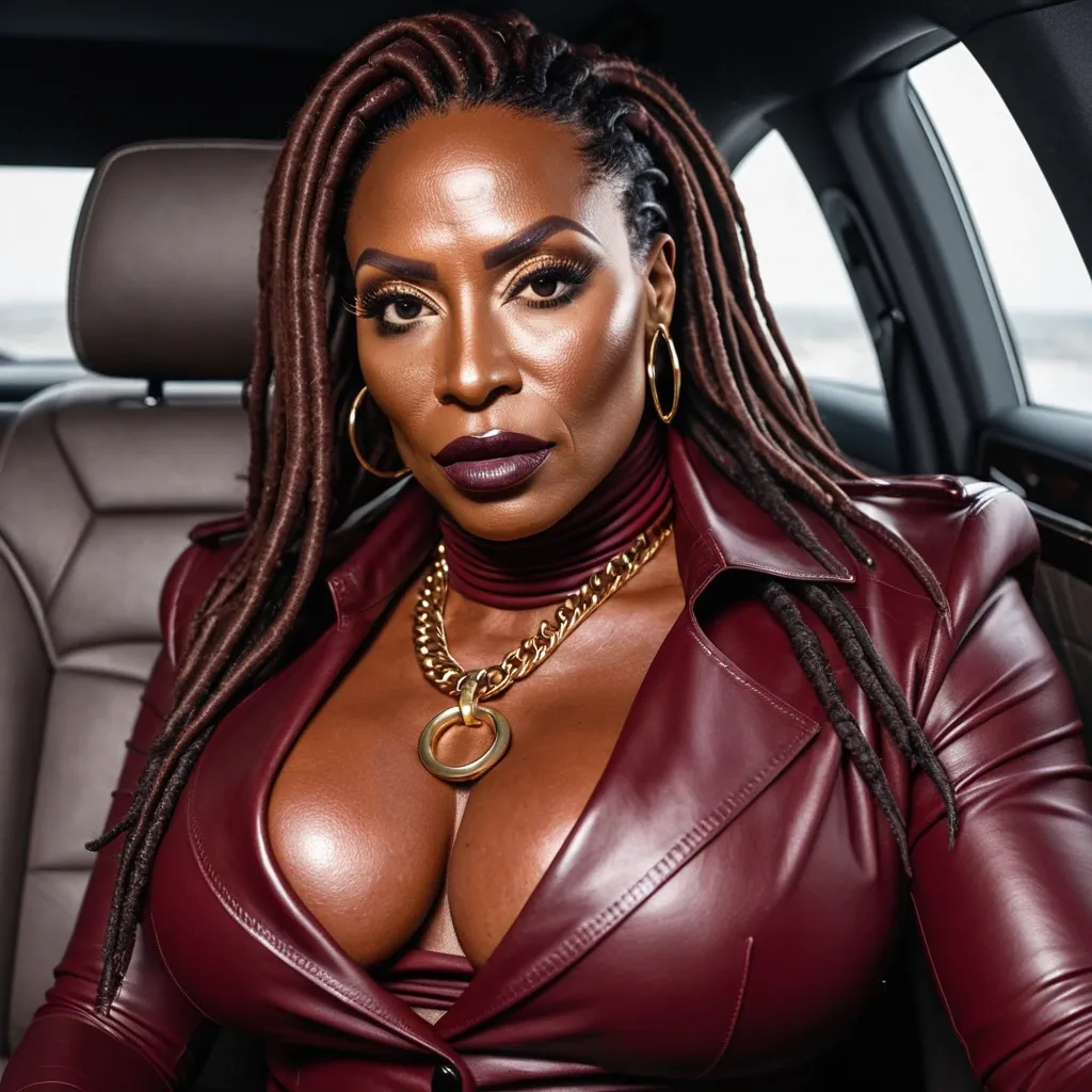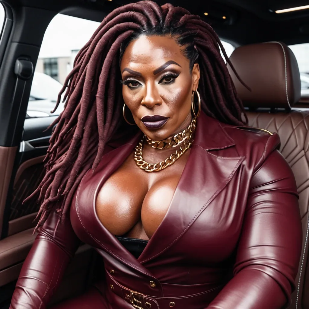 Generate Gorgeous 42 years old , female boss , dark-skinned African-American woman , bimbo , hourglass body , female bodybuilder , gorgeous , close up , full lips , big booty , brown , dreadlocks feminine silhouette , too big breast , big booty , sexy thighs abs , silhouette , up close , flexing biceps , beautiful brown eyes , legs are iconic and defining physical feature , both visually and in terms of combat ability.wearing an outfit that is a striking blend of elegance , power , and femininity , designed to command attention in any room. The suit is tailored to perfection , hugging the wearer’s curves with precision while emphasizing a structured silhouette. The fabric itself is a refined grey tweed patterned with subtle white grid lines , giving the suit a texture that feels both sophisticated and modern. The blazer features broad blue lapels and gold button accents , adding a luxurious touch that elevates the look beyond typical business attire. The matching high-waisted trousers elongate the frame , further enhancing the poised and commanding effect of the ensemble.The styling choices amplify the boldness of the suit. The inner blouse is a silky , greybutton-down shirt that complements the tweed’s tone while introducing a softer , feminine balance to the sharp tailoring of the jacket. The blouse peeks out neatly from under the blazer , maintaining elegance without drawing focus away from the suit’s commanding cut. Accessories are kept minimal yet intentional: a delicate layered gold necklace and hoop earrings that add glimmers of light and luxury without overpowering the outfit. The choice of voluminous , honey-brown braids cascading down her shoulders frames the face with both confidence and glamour , completing the commanding visual.Altogether , this look communicates a blend of authority and allure. It is business-ready yet fashion-forward , balancing corporate structure with vibrant femininity. The color palette blue , grey and gold avoids being overly delicate , instead embracing the richness of texture , structure , and presence. This is the kind of ensemble that speaks to ambition , sophistication , and personal style—ideal for someone who thrives in positions of influence but insists on expressing her individuality with bold elegance. It’s not just clothing—it’s a statement of power wrapped in grace. In luxury living legs that could crush a watermelon , skirt high boots are a bold and striking statement piece , crafted in glossy black patent leather that gives them a sleek , polished finish. Rising to just below the knee , the boots feature three adjustable buckle straps along the shaft , adding both edge and detail to their design. The towering stiletto heel , paired with a thick platform sole , creates an ultra-dramatic silhouette that elongates the leg and exudes power and confidence. With their combination of shine , height , and structure , these boots perfectly balance fierce femininity with high-fashion allure. High cheekbones , prominent jawline , gorgeous big brown eyes , freckles , enormous breast , gold necklace , turtleneck burgundy leather trench coat , brown t-shirt , brown t-shirt , closed collar buttoned up to top , burgundy leather skirt , sitting in backseat of luxurious car with grey leather seats , up close ,