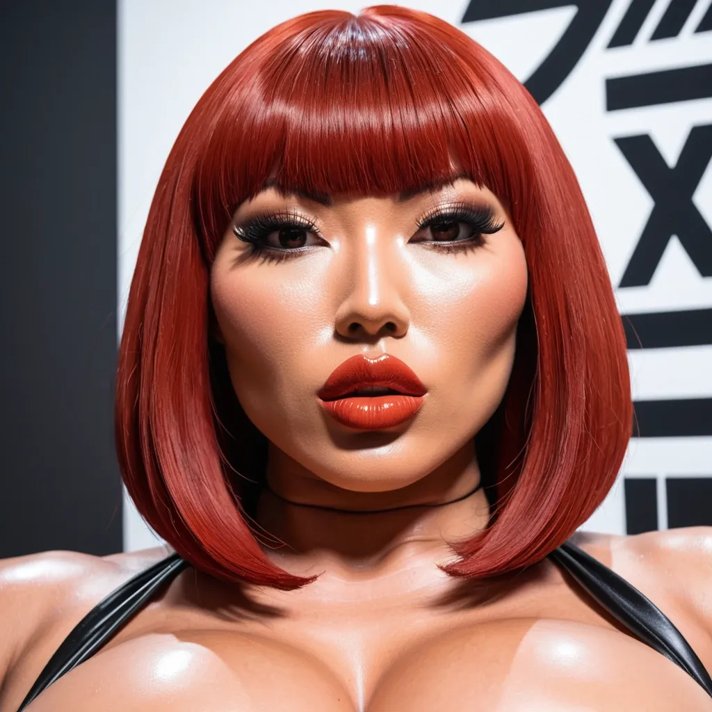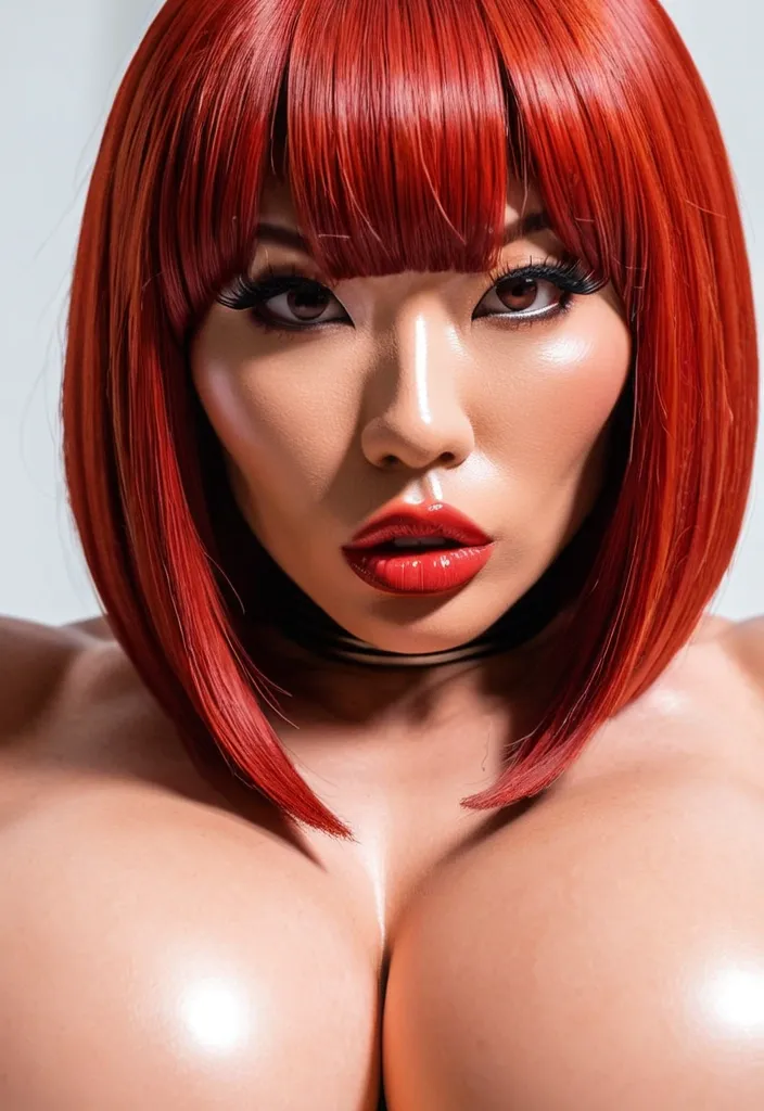 Generate Gorgeous female boss , Japanese woman , pointy face , bimbo , hourglass body , abnormally massive female bodybuilder , gorgeous , close up , full lips , big booty , red hair breast , bob-cut , bangs cover forhead design hair , feminine silhouette , too big breast , big booty , sexy thighs abs , silhouette , up close , flexing biceps , beautiful green eyes , legs are iconic and defining physical feature , both visually and in terms of combat ability.wearing an outfit that is a striking blend of elegance , power , and femininity , designed to command attention in any room. The suit is tailored to perfection , hugging the wearer’s curves with precision while emphasizing a structured silhouette. The fabric itself is a refined grey tweed patterned with subtle white grid lines , giving the suit a texture that feels both sophisticated and modern. The blazer features broad blue lapels and gold button accents , adding a luxurious touch that elevates the look beyond typical business attire. The matching high-waisted trousers elongate the frame , further enhancing the poised and commanding effect of the ensemble.The styling choices amplify the boldness of the suit. The inner blouse is a silky , greybutton-down shirt that complements the tweed’s tone while introducing a softer , feminine balance to the sharp tailoring of the jacket. The blouse peeks out neatly from under the blazer , maintaining elegance without drawing focus away from the suit’s commanding cut. Accessories are kept minimal yet intentional: a delicate layered gold necklace and hoop earrings that add glimmers of light and luxury without overpowering the outfit. The choice oframes the face with both confidence and glamour , completing the commanding visual.Altogether , this look communicates a blend of authority and allure. It is business-ready yet fashion-forward , balancing corporate structure with vibrant femininity. The color palette blue , grey and gold avoids being overly delicate , instead embracing the richness of texture , structure , and presence. This is the kind of ensemble that speaks to ambition , sophistication , and personal style—ideal for someone who thrives in positions of influence but insists on expressing her individuality with bold elegance. It’s not just clothing—it’s a statement of power wrapped in grace. In luxury living legs that could crush a watermelon , skirt high boots are a bold and striking statement piece , crafted in glossy black patent leather that gives them a sleek , polished finish. Rising to just below the knee , the boots feature three adjustable buckle straps along the shaft , adding both edge and detail to their design. The towering stiletto heel , paired with a thick platform sole , creates an ultra-dramatic silhouette that elongates the leg and exudes power and confidence. With their combination of shine , height , and structure , these boots perfectly balance fierce femininity with high-fashion allure. Gorgeous brown eyes , nose ring , big lips glossy lips , enormous butt , enormous breast , up close shot ,