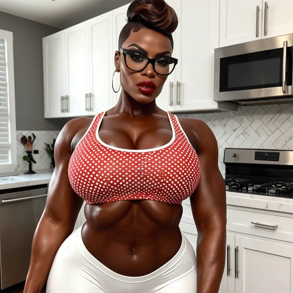 Generate Gorgeous female boss , bimbo , eye glasses , very dark-skinned African-American woman , very big lips , hourglass body , abnormally massive female bodybuilder , gorgeous , close up , full lips , big booty , brown hair , short pixie hair , feminine silhouette , too big breast , big booty , sexy thighs abs , silhouette , up close , flexing biceps , beautiful brown eyes , legs are iconic and defining physical feature , both visually and in terms of combat ability.wearing an outfit that is a striking blend of elegance , power , and femininity , designed to command attention in any room. The suit is tailored to perfection , hugging the wearer’s curves with precision while emphasizing a structured silhouette. The fabric itself is a refined grey tweed patterned with subtle white grid lines , giving the suit a texture that feels both sophisticated and modern. The blazer features broad blue lapels and gold button accents , adding a luxurious touch that elevates the look beyond typical business attire. The matching high-waisted trousers elongate the frame , further enhancing the poised and commanding effect of the ensemble.The styling choices amplify the boldness of the suit. The inner blouse is a silky , greybutton-down shirt that complements the tweed’s tone while introducing a softer , feminine balance to the sharp tailoring of the jacket. The blouse peeks out neatly from under the blazer , maintaining elegance without drawing focus away from the suit’s commanding cut. Accessories are kept minimal yet intentional: a delicate layered gold necklace and hoop earrings that add glimmers of light and luxury without overpowering the outfit. The choice of voluminous , honey-brown braids cascading down her shoulders frames the face with both confidence and glamour , completing the commanding visual.Altogether , this look communicates a blend of authority and allure. It is business-ready yet fashion-forward , balancing corporate structure with vibrant femininity. The color palette blue , grey and gold avoids being overly delicate , instead embracing the richness of texture , structure , and presence. This is the kind of ensemble that speaks to ambition , sophistication , and personal style—ideal for someone who thrives in positions of influence but insists on expressing her individuality with bold elegance. It’s not just clothing—it’s a statement of power wrapped in grace. In luxury living legs that could crush a watermelon , skirt high boots are a bold and striking statement piece , crafted in glossy black patent leather that gives them a sleek , polished finish. Rising to just below the knee , the boots feature three adjustable buckle straps along the shaft , adding both edge and detail to their design. The towering stiletto heel , paired with a thick platform sole , creates an ultra-dramatic silhouette that elongates the leg and exudes power and confidence. With their combination of shine , height , and structure , these boots perfectly balance fierce femininity with high-fashion allure. High cheekbones , prominent jawline , gorgeous big brown eyes , , enormous breast , red and white pin-dot tank top , white pants , enormous butt , powerful hips , in the the kitchen , long dress ,
