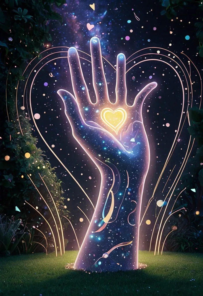 A surreal scene of a human arm rises , made of stardust , offering a glowing , abstract heart , with the punchline 'You make my heart glow!' subtly integrated into the background garden , upward from the ground. The style is a fusion of ethereal abstract art and cosmic elements , with a soft , luminous quality. ,
