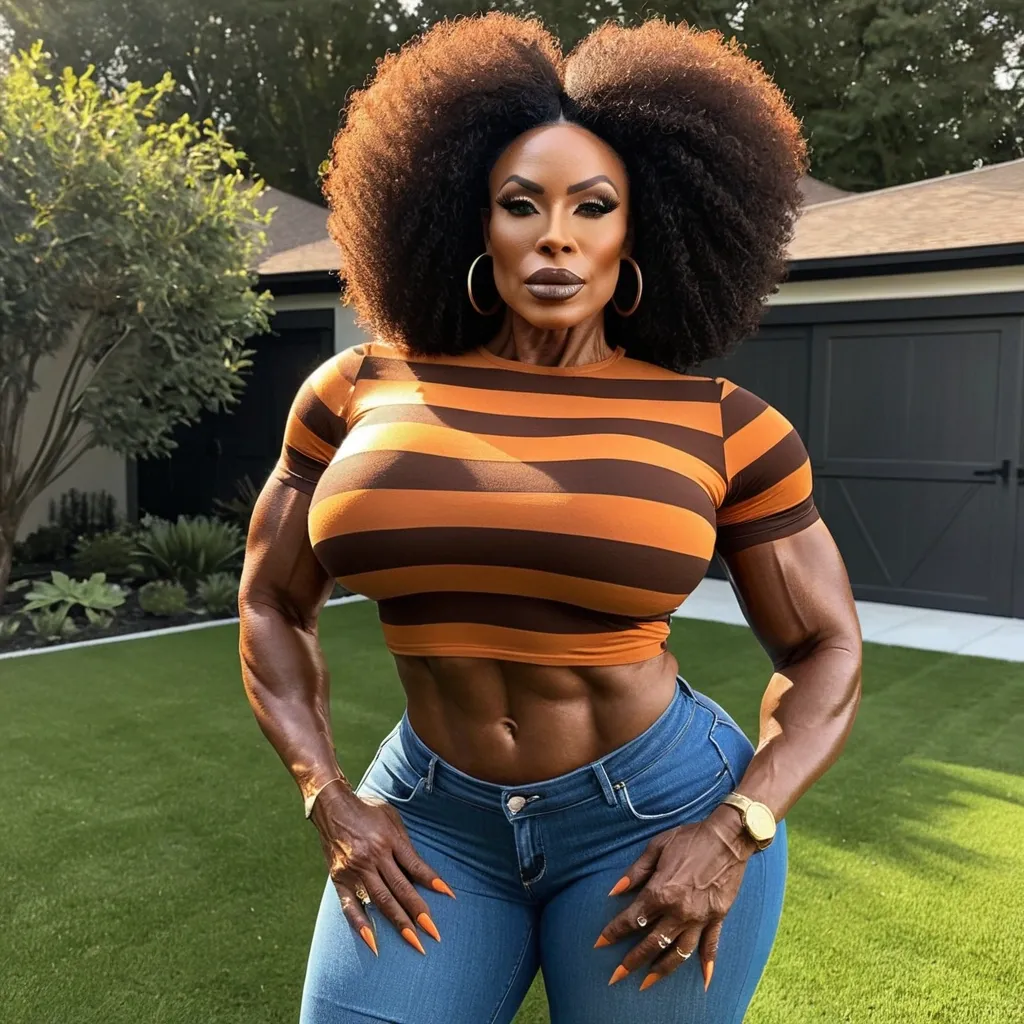 Generate Gorgeous 42 years old , female boss , dark-skinned African-American woman , pointy face , bimbo , hourglass body , abnormally massive female bodybuilder , gorgeous , close up , full lips , big booty , stylish afro , bald on the side , feminine silhouette , too big breast , big booty , sexy thighs abs , silhouette , up close , flexing biceps , beautiful brown eyes , legs are iconic and defining physical feature , both visually and in terms of combat ability.wearing an outfit that is a striking blend of elegance , power , and femininity , designed to command attention in any room. The suit is tailored to perfection , hugging the wearer’s curves with precision while emphasizing a structured silhouette. The fabric itself is a refined grey tweed patterned with subtle white grid lines , giving the suit a texture that feels both sophisticated and modern. The blazer features broad blue lapels and gold button accents , adding a luxurious touch that elevates the look beyond typical business attire. The matching high-waisted trousers elongate the frame , further enhancing the poised and commanding effect of the ensemble.The styling choices amplify the boldness of the suit. The inner blouse is a silky , greybutton-down shirt that complements the tweed’s tone while introducing a softer , feminine balance to the sharp tailoring of the jacket. The blouse peeks out neatly from under the blazer , maintaining elegance without drawing focus away from the suit’s commanding cut. Accessories are kept minimal yet intentional: a delicate layered gold necklace and hoop earrings that add glimmers of light and luxury without overpowering the outfit. The choice of voluminous , honey-brown braids cascading down her shoulders frames the face with both confidence and glamour , completing the commanding visual.Altogether , this look communicates a blend of authority and allure. It is business-ready yet fashion-forward , balancing corporate structure with vibrant femininity. The color palette blue , grey and gold avoids being overly delicate , instead embracing the richness of texture , structure , and presence. This is the kind of ensemble that speaks to ambition , sophistication , and personal style—ideal for someone who thrives in positions of influence but insists on expressing her individuality with bold elegance. It’s not just clothing—it’s a statement of power wrapped in grace. In luxury living legs that could crush a watermelon , skirt high boots are a bold and striking statement piece , crafted in glossy black patent leather that gives them a sleek , polished finish. Rising to just below the knee , the boots feature three adjustable buckle straps along the shaft , adding both edge and detail to their design. The towering stiletto heel , paired with a thick platform sole , creates an ultra-dramatic silhouette that elongates the leg and exudes power and confidence. With their combination of shine , height , and structure , these boots perfectly balance fierce femininity with high-fashion allure. High cheekbones , prominent jawline , gorgeous big brown light brown honey , , enormous breast , orange , and black striped t-shirt , gold and blue jeans standing in backyard of a modern nice back yard ,