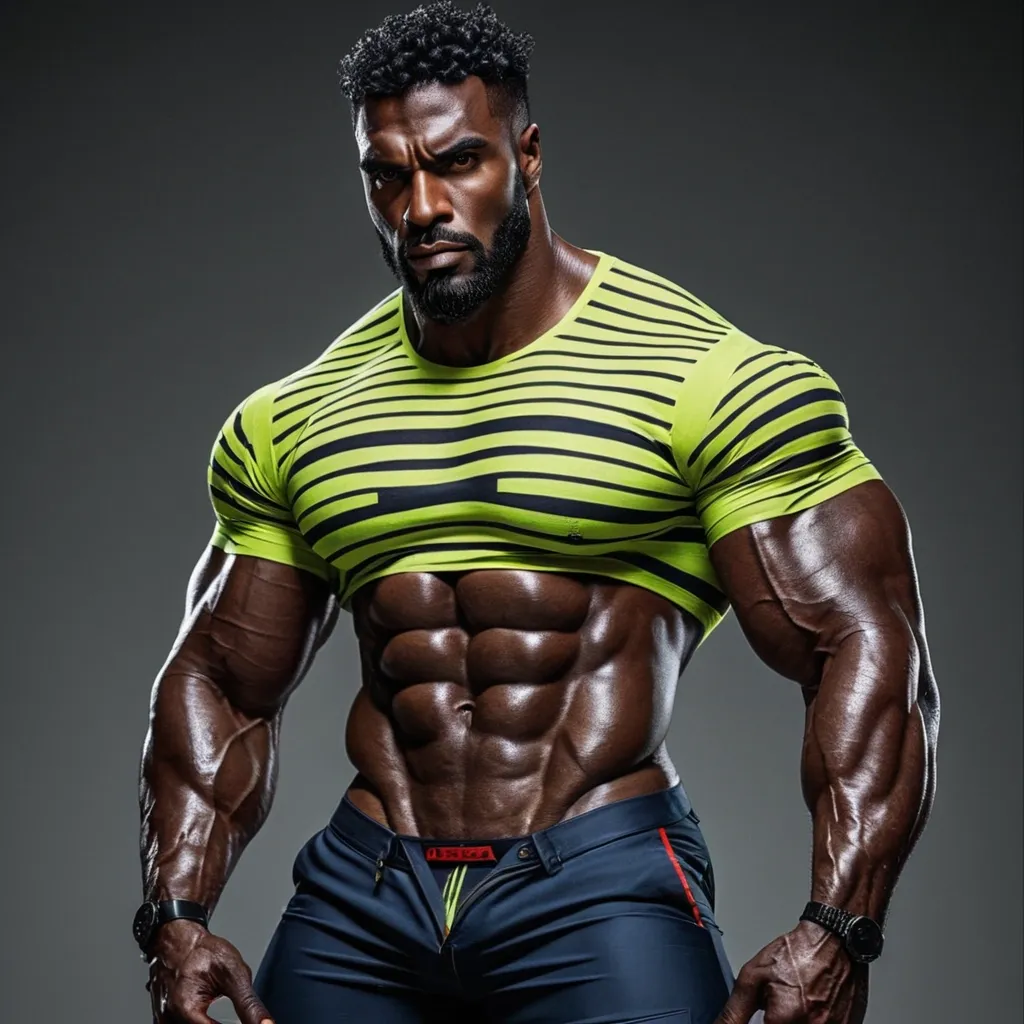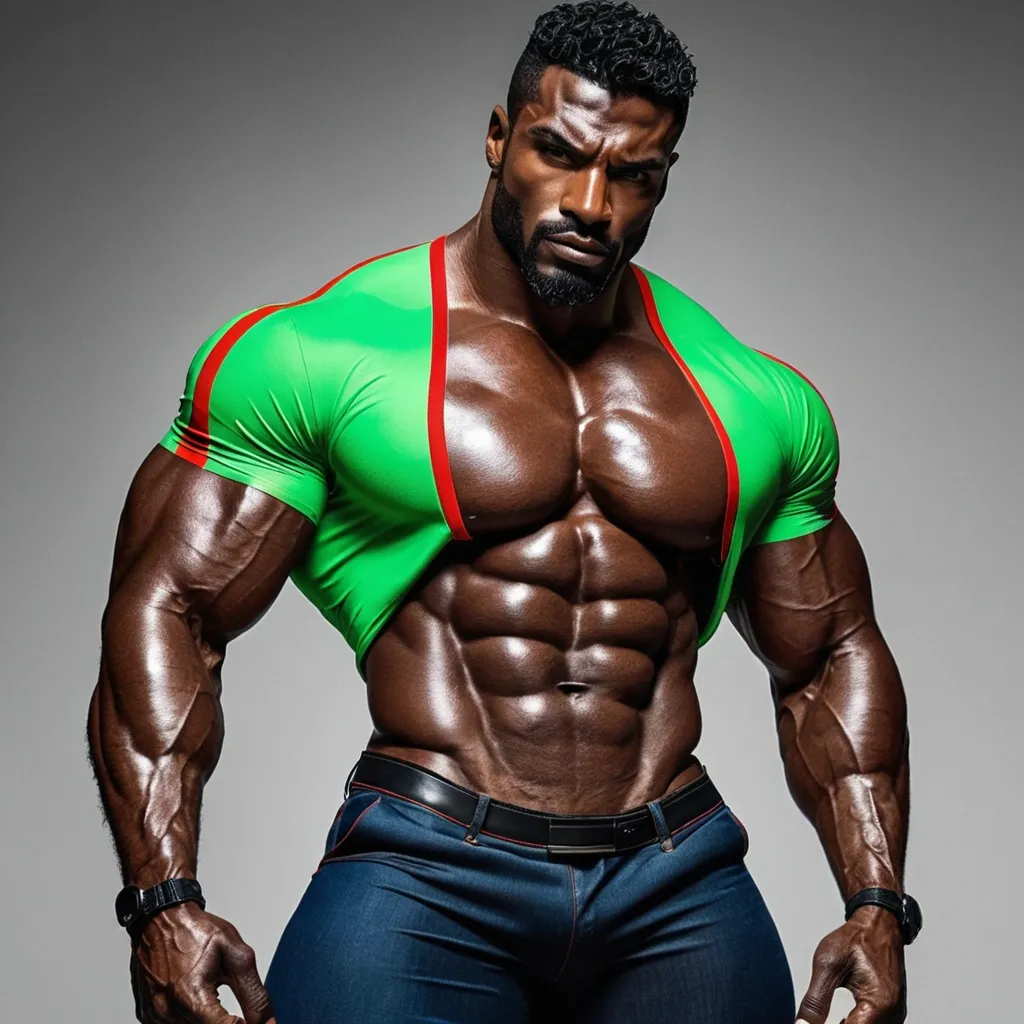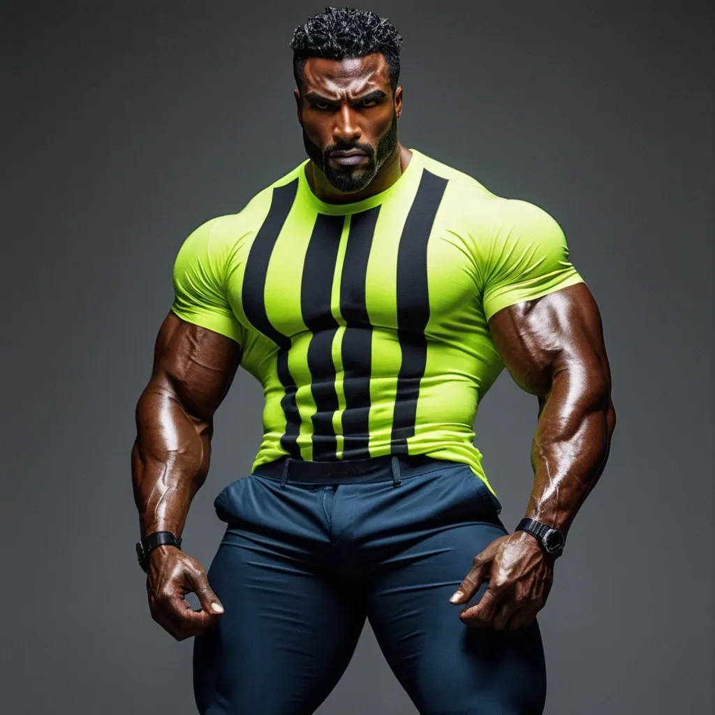 Generate ruggedly handsome dark-skinned African-American man abnormally massive male bodybuilder , , close up , full lips , big booty , black trimmed coarse hair , big , muscular man , brown strikingly intense and alluring eyes , up close , flexing biceps , beautiful brown eyes , legs are iconic and defining physical feature , both visually and in terms of combat ability.wearing an outfit that is a striking blend of elegance , power , and femininity , designed to command attention in any room. The suit is tailored to perfection , hugging the wearer’s curves with precision while emphasizing a structured silhouette. The fabric itself is a refined grey tweed patterned with subtle white grid lines , giving the suit a texture that feels both sophisticated and modern. The blazer features broad blue lapels and gold button accents , adding a luxurious touch that elevates the look beyond typical business attire. The matching high-waisted trousers elongate the frame , further enhancing the poised and commanding effect of the ensemble.The styling choices amplify the boldness of the suit. The inner shirt is a silky , greybutton-down shirt that complements the tweed’s tone while introducing a masculine balance to the sharp tailoring of the jacket. The shirt peeks out neatly from under the blazer , maintaining elegance without drawing focus away from the suit’s commanding cut. Accessories are kept minimal yet intentional: a delicate layered gold necklace ad alpha leader of light and luxury without overpowering the outfit completing the commanding visual.Altogether , this look communicates a blend of authority and allure. It is business-ready yet fashion-forward , balancing corporate structure with vibrant femininity. The color palette blue , grey and gold avoids being overly delicate , instead embracing the richness of texture , structure , and presence. This is the kind of ensemble that speaks to ambition , sophistication , and personal style—ideal for someone who thrives in positions of influence but insists on expressing her individuality with bold elegance. It’s not just clothing—it’s a statement of power wrapped in grace. In luxury living legs that could crush a watermelon , skirt high boots are a bold and striking statement piece , crafted in glossy black patent leather that gives them a sleek , polished finish. Rising to just below the knee , the boots feature three adjustable buckle straps along the shaft , adding both edge and detail to their design. The towering stiletto heel , paired with a thick platform sole , creates an ultra-dramatic silhouette that elongates the leg and exudes power and confidence. With their combination of shine , height , and structure , these boots perfectly balance fierce femininity with high-fashion allure , He’s wearing a sharp three-piece suit layered under a long , lime green shirt. Black and red striped Futuristic t-shirt and blue jeans. ,