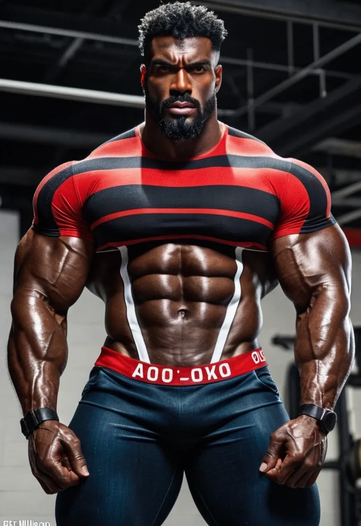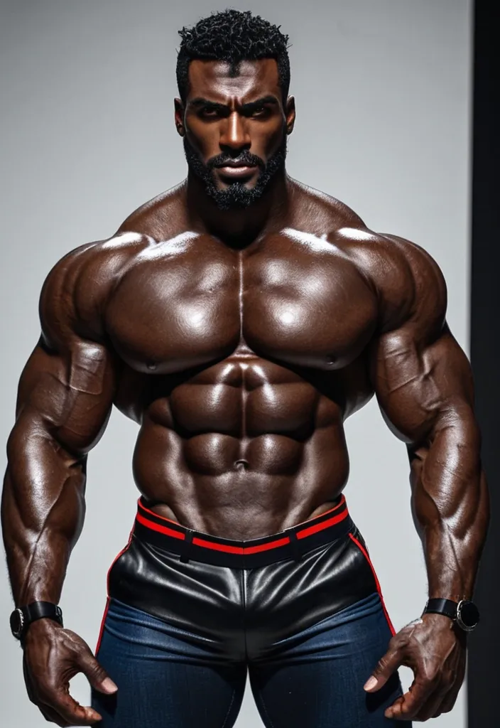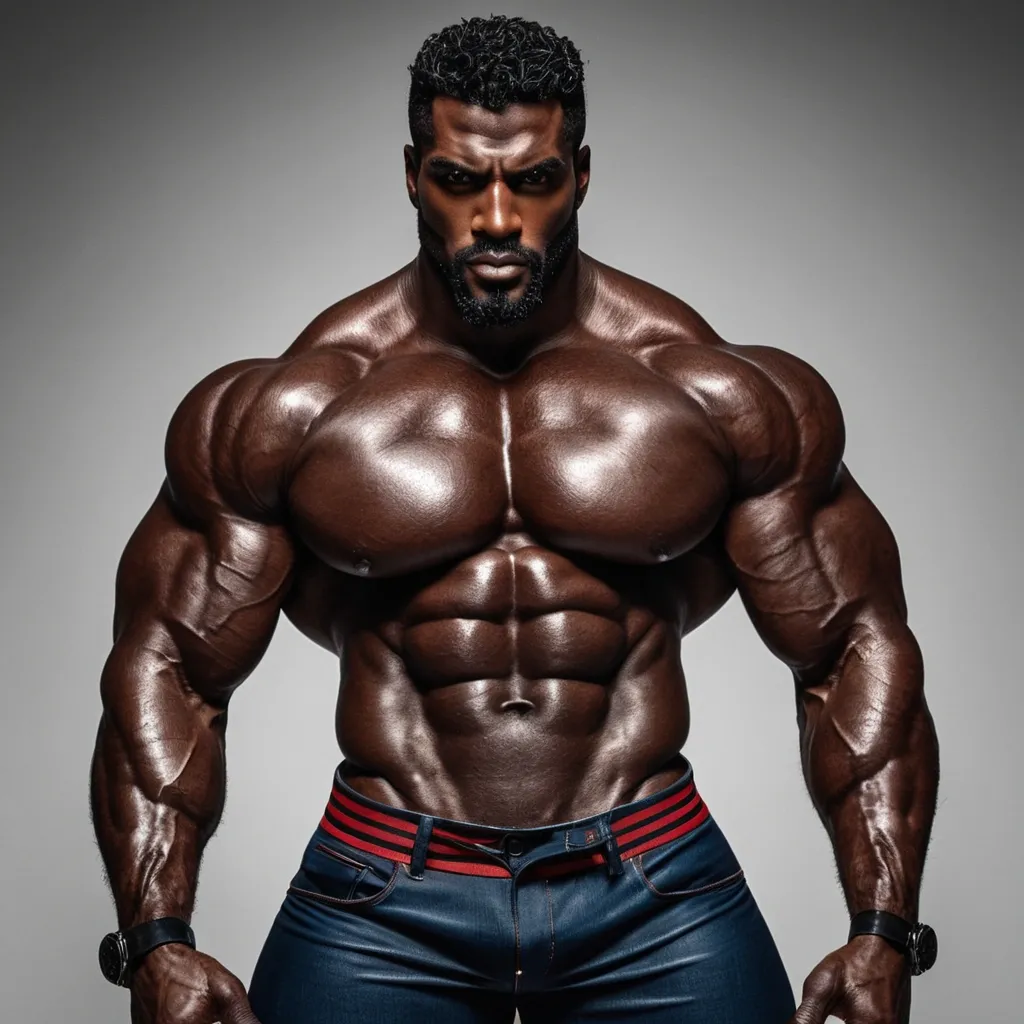 Generate ruggedly handsome dark-skinned African-American man abnormally massive male bodybuilder , , close up , full lips , big booty , black trimmed coarse hair , big , muscular man , brown strikingly intense and alluring eyes , up close , flexing biceps , beautiful brown eyes , legs are iconic and defining physical feature , both visually and in terms of combat ability.wearing an outfit that is a striking blend of elegance , power , and femininity , designed to command attention in any room. The suit is tailored to perfection , hugging the wearer’s curves with precision while emphasizing a structured silhouette. The fabric itself is a refined grey tweed patterned with subtle white grid lines , giving the suit a texture that feels both sophisticated and modern. The blazer features broad blue lapels and gold button accents , adding a luxurious touch that elevates the look beyond typical business attire. The matching high-waisted trousers elongate the frame , further enhancing the poised and commanding effect of the ensemble.The styling choices amplify the boldness of the suit. The inner shirt is a silky , greybutton-down shirt that complements the tweed’s tone while introducing a masculine balance to the sharp tailoring of the jacket. The shirt peeks out neatly from under the blazer , maintaining elegance without drawing focus away from the suit’s commanding cut. Accessories are kept minimal yet intentional: a delicate layered gold necklace ad alpha leader of light and luxury without overpowering the outfit completing the commanding visual.Altogether , this look communicates a blend of authority and allure. It is business-ready yet fashion-forward , balancing corporate structure with vibrant femininity. The color palette blue , grey and gold avoids being overly delicate , instead embracing the richness of texture , structure , and presence. This is the kind of ensemble that speaks to ambition , sophistication , and personal style—ideal for someone who thrives in positions of influence but insists on expressing her individuality with bold elegance. It’s not just clothing—it’s a statement of power wrapped in grace. In luxury living legs that could crush a watermelon , skirt high boots are a bold and striking statement piece , crafted in glossy black patent leather that gives them a sleek , polished finish. Rising to just below the knee , the boots feature three adjustable buckle straps along the shaft , adding both edge and detail to their design. The towering stiletto heel , paired with a thick platform sole , creates an ultra-dramatic silhouette that elongates the leg and exudes power and confidence. With their combination of shine , height , and structure , these boots perfectly balance fierce femininity with high-fashion allure , Black and red striped t-shirt and blue jeans. ,