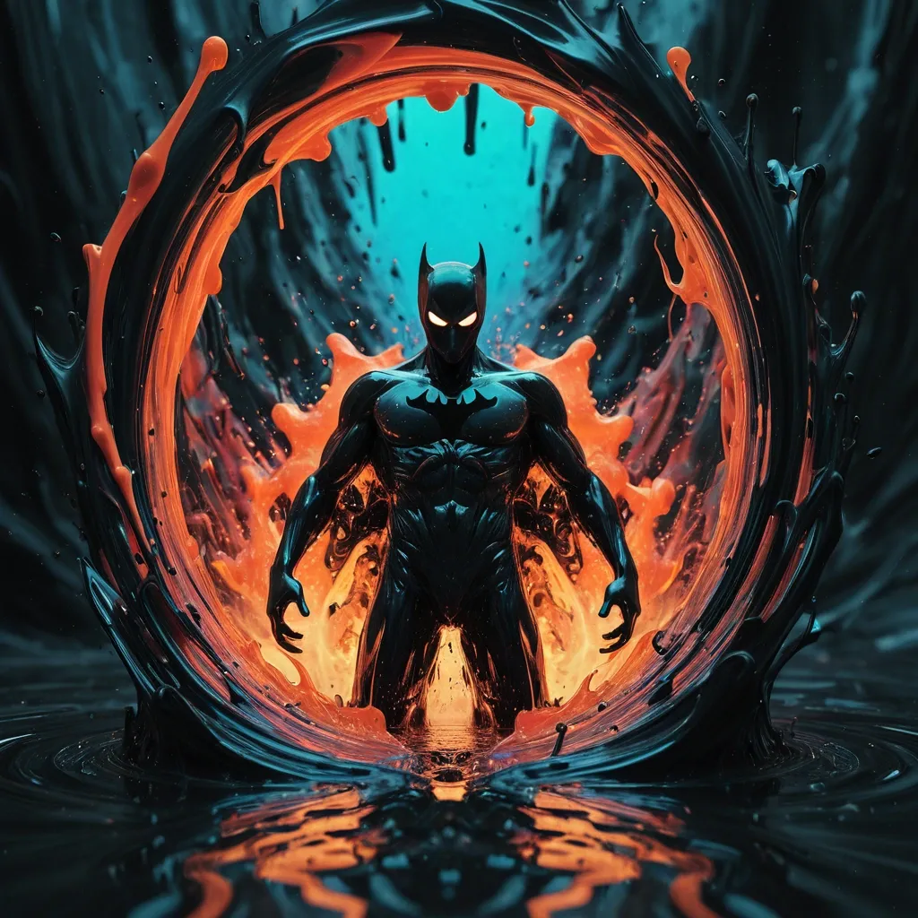 A surreal image depicting a lone Bat-man Face at the center of an explosive Black blurred that seems to swirling from the ground. The figure , vortex by motion , appears to be bracing themselves against a torrent of liquid or molten liquid , their stance wide and defiant. The style is highly surreal and abstract , with a focus on vibrant , saturated colors and sharp , defined edges , reminiscent of digital art by Beeple. ,