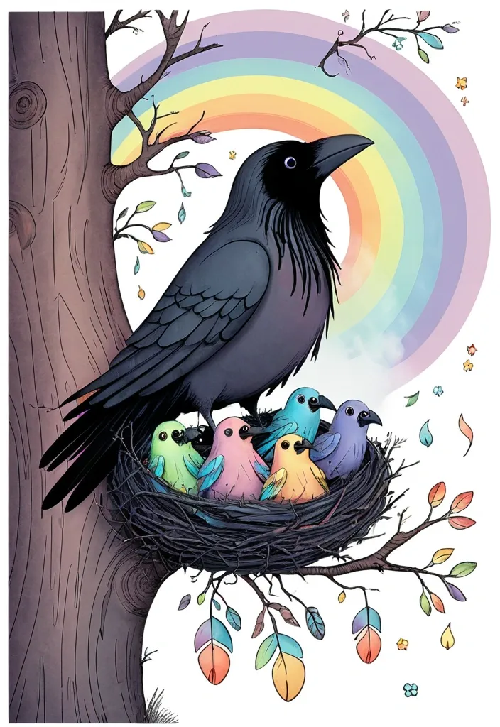 A vibrant , surreal landscape unfolds , dominated by an intricately twisted tree whose trunk emerges from the ground , resembling the form of a serene woman with a rounded head of lush green foliage. Below , Peacock—stands peacefully , as if in harmony with the natural world. Above , a large , circular face colored in shades of green and adorned with a subtle smile watches over the scene , embodying a celestial presence. Cascading from the tree and suspended in the air are colorful Foliage , echoing the organic themes throughout the composition. The backdrop features gentle undulations of blue-green hills and a soft pink sky , blending warm and cool tones that enhance the dreamlike atmosphere , inviting viewers into a mystical connection between humanity and nature. ,