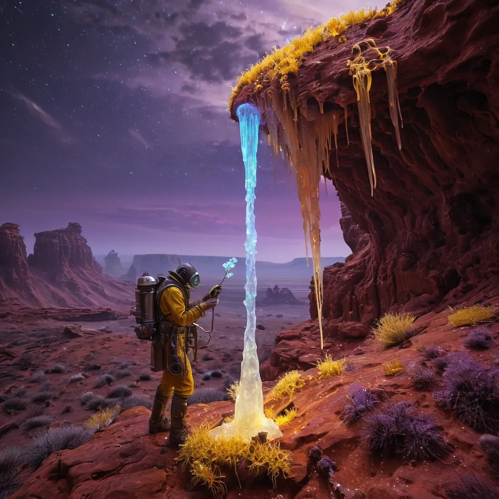 A lone tribal tending to a bioluminescent fungus and crystal on a red rock cliff , the fungus pulsing with soft , ethereal light. The landscape is dotted with strange , crystalline rock formations under a sky swirling with dust whirlwind of yellow and violet. The scene is rendered in a hyperrealistic style , with incredible attention to detail in the textures of the tribal suit , evoking a sense of wonder and scientific exploration. influences from the 'Fallout' aesthetic. ,