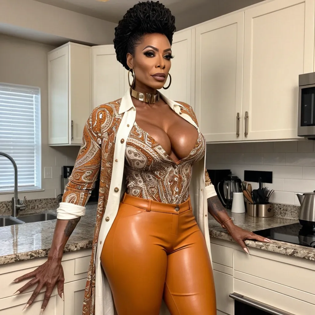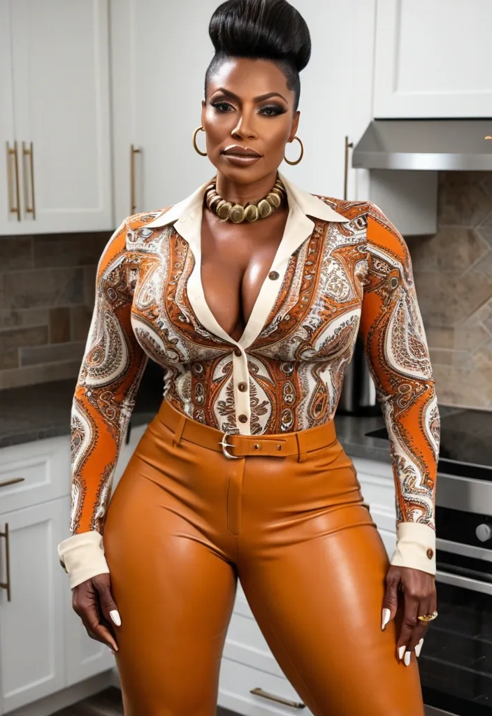 42 years old , dark-skinned African-American woman — extremely beautiful , with a presence that feels quietly dangerous and quietly royal at the same time. She has that soft glow in her skin that looks effortless , like she wakes up looking like this every day without trying , but everyone knows she still probably puts in discipline the old fashioned way. Her bone structure is model tier… cheekbones that could cut through pride , a jawline that says she doesn’t bend for just anybody , and soft lips that hold mystery and restraint all at once.Her futuristic hairdo , cropped close , styled in textured waves that shape her face like an artist’s finishing brush stroke. It gives her a striking , modern elegance — feminine , but with that slight edge that tells you she’s not the type anyone ever controls. Her eyebrows are naturally bold and shaped sharply , framing her honey hazel eyes that practically glow with their own weather system. Those eyes… you could lose a fight in those eyes before she ever speaks a word.She has luminous , glossy skin that reflects light like polished bronze catching early morning sun. Natural freckles sprinkle just lightly across her cheeks , softening the intimidation factor with a hint of youthful innocence. The way the light hits her face makes her look sculpted — like an ultra realistic painting brought to life. Everything about her looks intentional… but also like she was born this way.There’s also this quiet calm in her expression — not emotional weakness — but a poised , unshakeable stillness that only comes from knowing exactly who you are and not needing to defend it. She looks like the woman who never rushes into noise… she waits , she observes , she lets the room shift around her while she remains unmoved. That alone is power — and she wears it naturally like an old soul who understands her worth in ways other people are still scrambling to figure out , blonde short short futuristic pompadour hair , muscular body builder woman , , enormous breast , enormous buttThe low-cut top emphasizes her posture , drawing attention to her chest as she gazes directly ahead. standing in kitchen , enormous butt , , Enormous breast , facing camera , modest top , button up -t-shirt , closed collar , modest collar orange , brown , and beige accent modest t-shirt , beige leather pants , closed collar top , yellow undershirt t-shirt , She’s wearing a long , elegant paisley-patterned dress paired with a cream-colored buttoned cardigan , giving her a soft , cozy , bohemian feminine style. , brown jacket ,