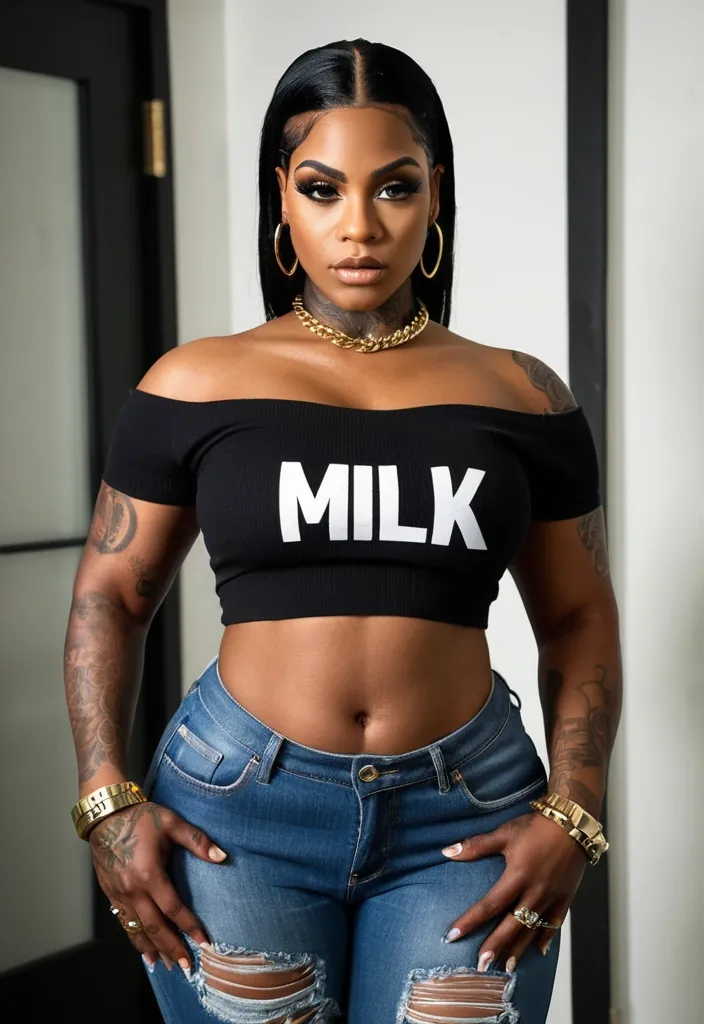 She’s rocking a short , tightly-cropped blonde cut — almost a platinum buzz-fade — that frames her face with sharp , confident precision. It’s bold , stylish , and fits her attitude like a glove.EyesHer eyes are big , dramatic , and expressive , highlighted with thick lashes and sharp eyeliner that gives her a fierce , glam look. They’re the kind of eyes that say , “I run this place.”BodyShe’s a thick , curvy , powerful dark-skinned African-American woman with a strong hourglass build. Her arms , chest , and midsection are covered in detailed tattoos , giving her that mix of beauty , attitude , and artistry. She looks like someone who works hard , knows her worth , and moves with confidence.ClothesShe’s wearing a black off-the-shoulder crop top that reads “Milk” across the chest — stylish , playful , and bold. Her jeans are high-waisted , form-fitting , and ripped at the thighs , showing off her shape. She’s also stacked with gold accessories — layered necklaces , bracelets , and big hoop earrings — adding serious flare. Enormous butt , enormous breast , exaggerated hips ,